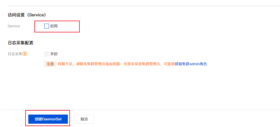 6. 取消勾选访问设置 > Service ,确认配置项已填写好后,单击创建 Daemonset 即可。