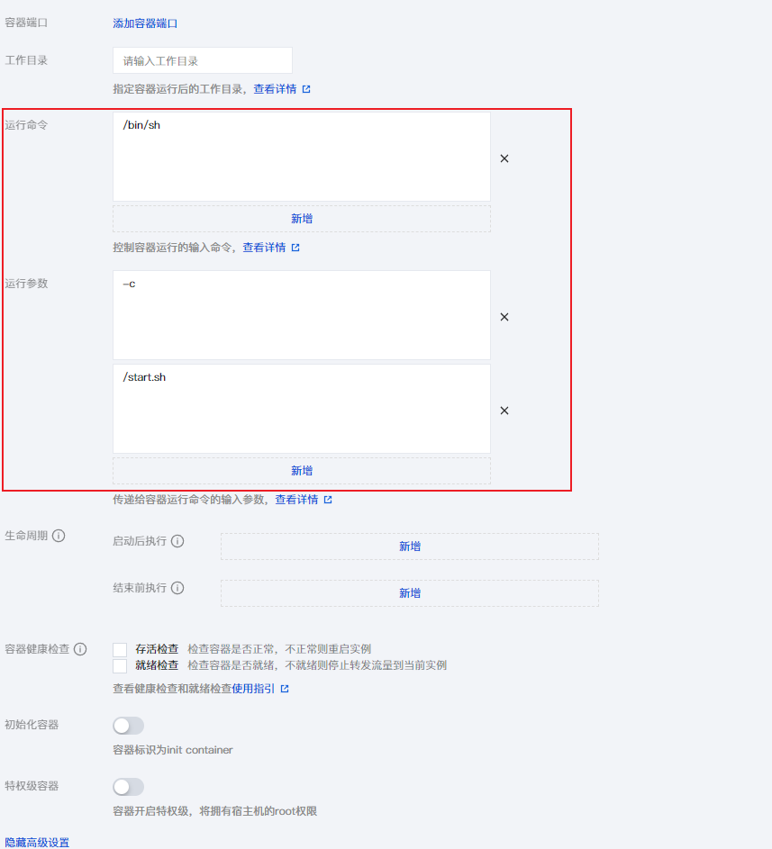 5. 单击实例内容器 > 显示高级设置,配置启动参数。