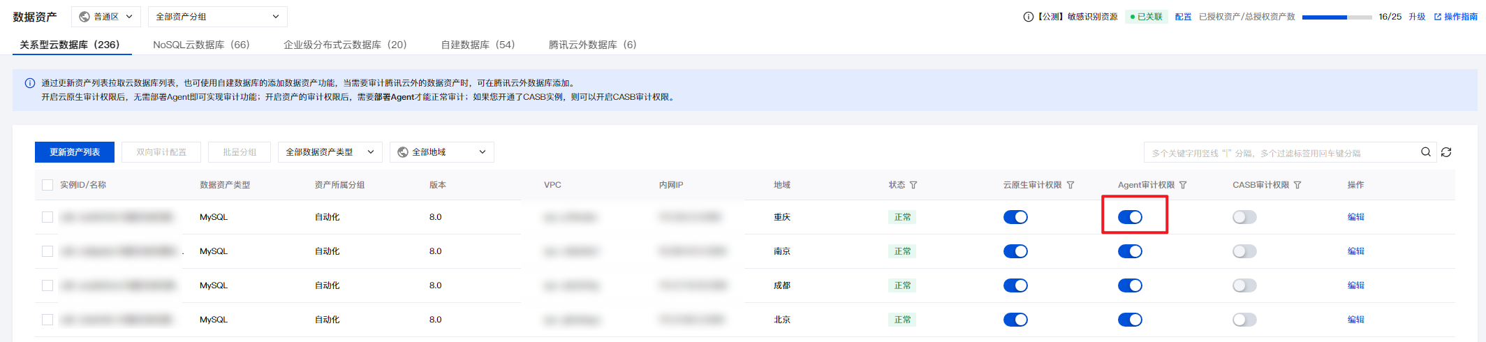 2. 在数据资产页面,选择需要开启审计的资产,并启用该资产的 Agent 审计权限。