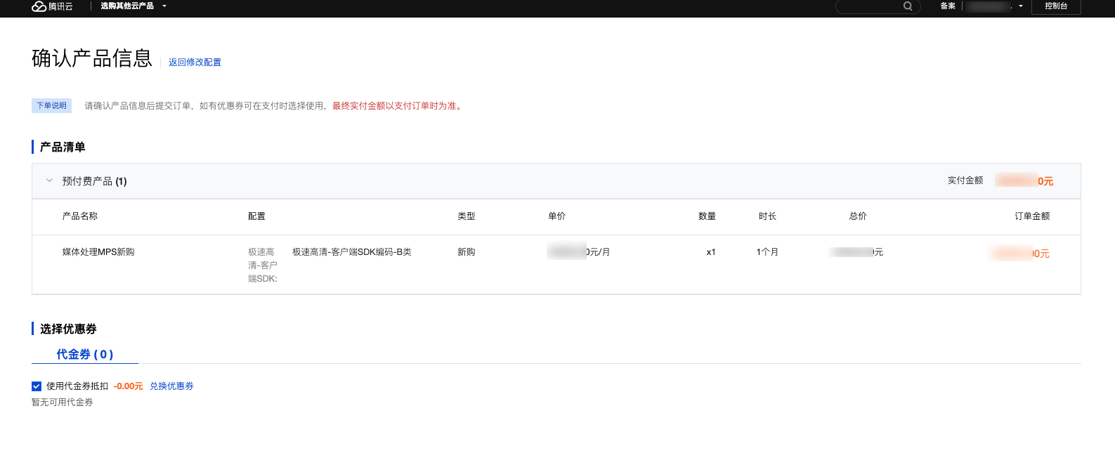选定所需 SDK 配置信息后,单击立即购买查看本次支付的产品信息。