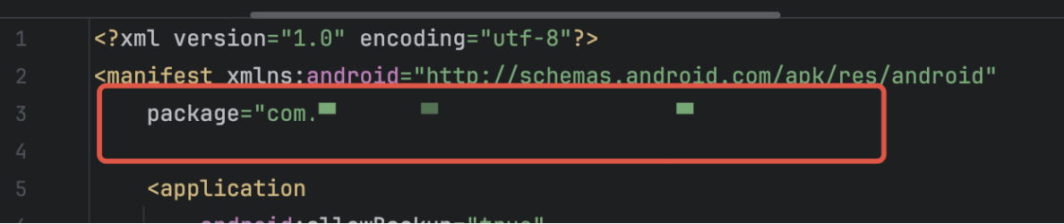 查看 AndroidManifest.xml ⽂件中的 manifest 中的 package 字段标识。