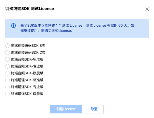 在页面中单击新建测试 License,选择试用所需的 SDK 类型和版本。确定后继续单击创建 License 即可完成申请。