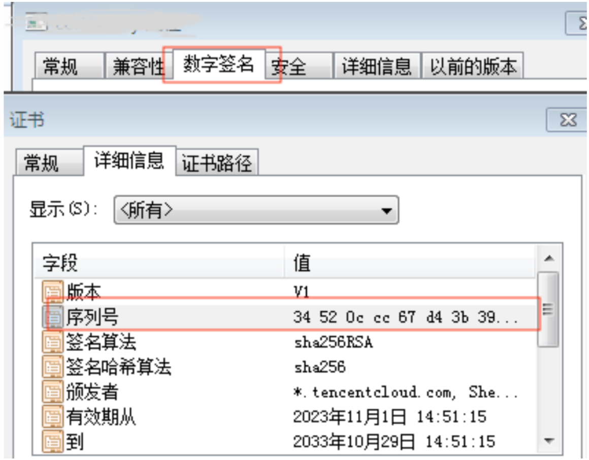 查看已签名应用的数字签名来获取签名序列号:点击应用 exe,右键选择属性 > 数字签名 > 详细信息来查看证书。