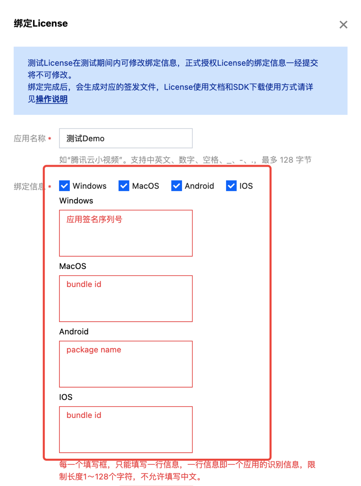 在已购买的 License 上,填写 App 的绑定信息,确认后服务将正式生效。