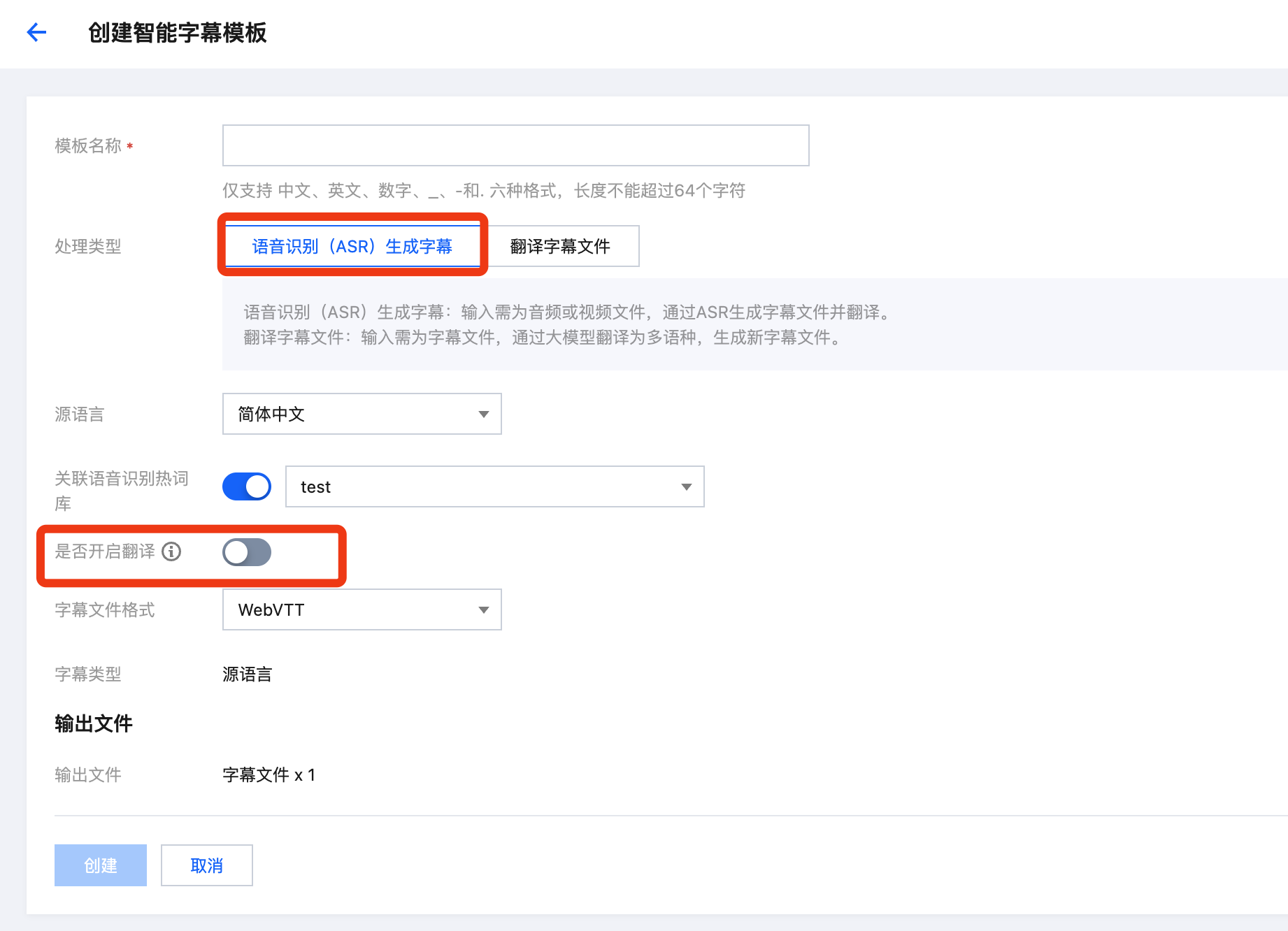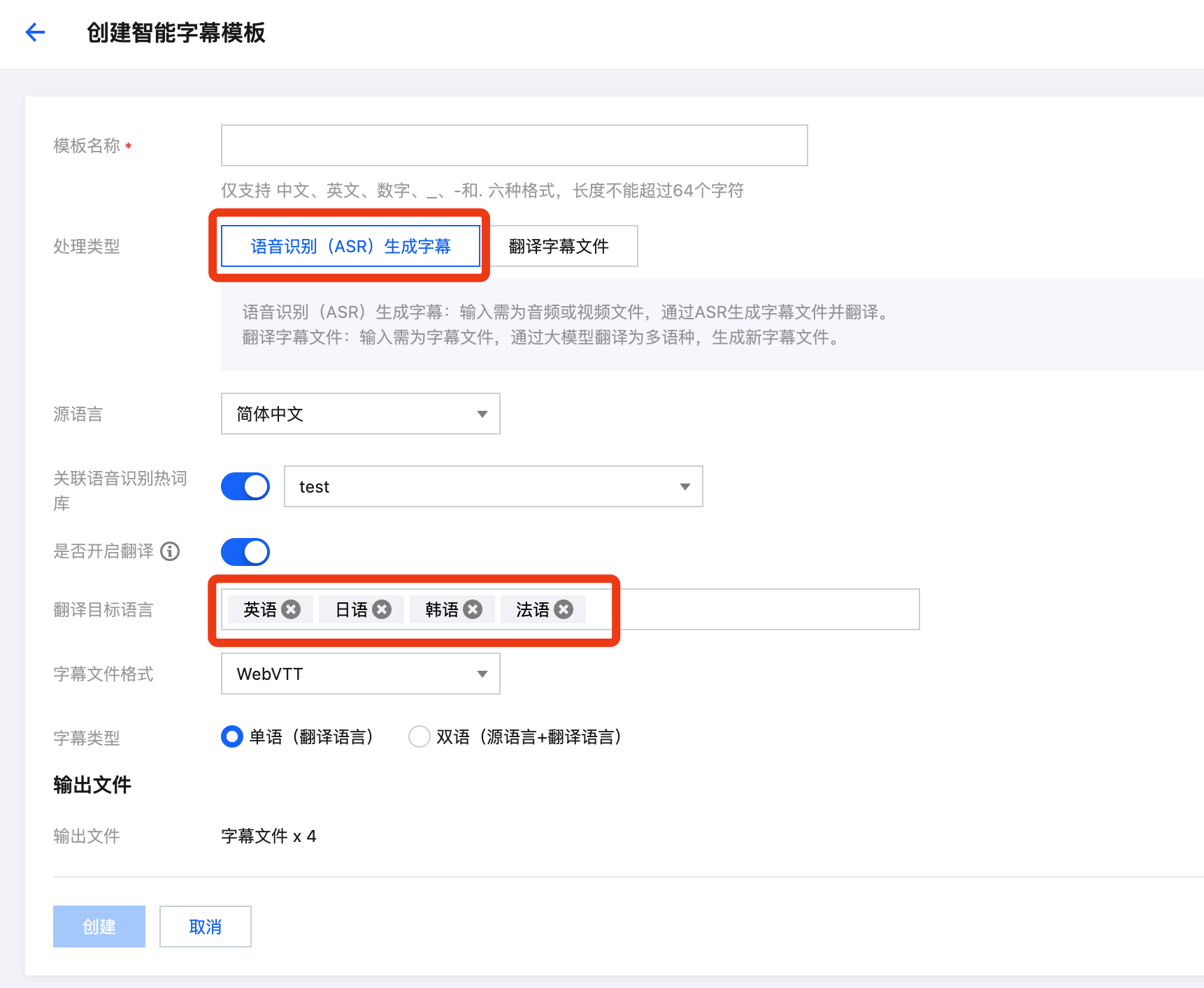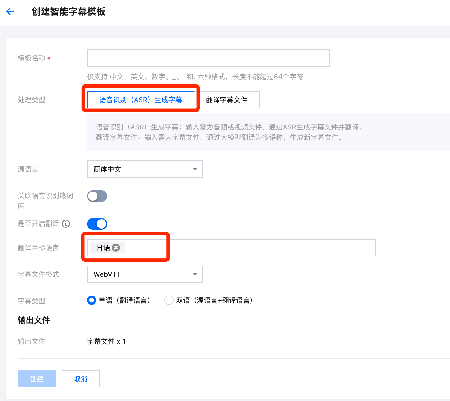处理类型选择「语音识别(ASR)生成字幕」,开启翻译,并选择了一个翻译目标语言,将会收取「语音翻译」费用,定价请参考 计费说明文档。