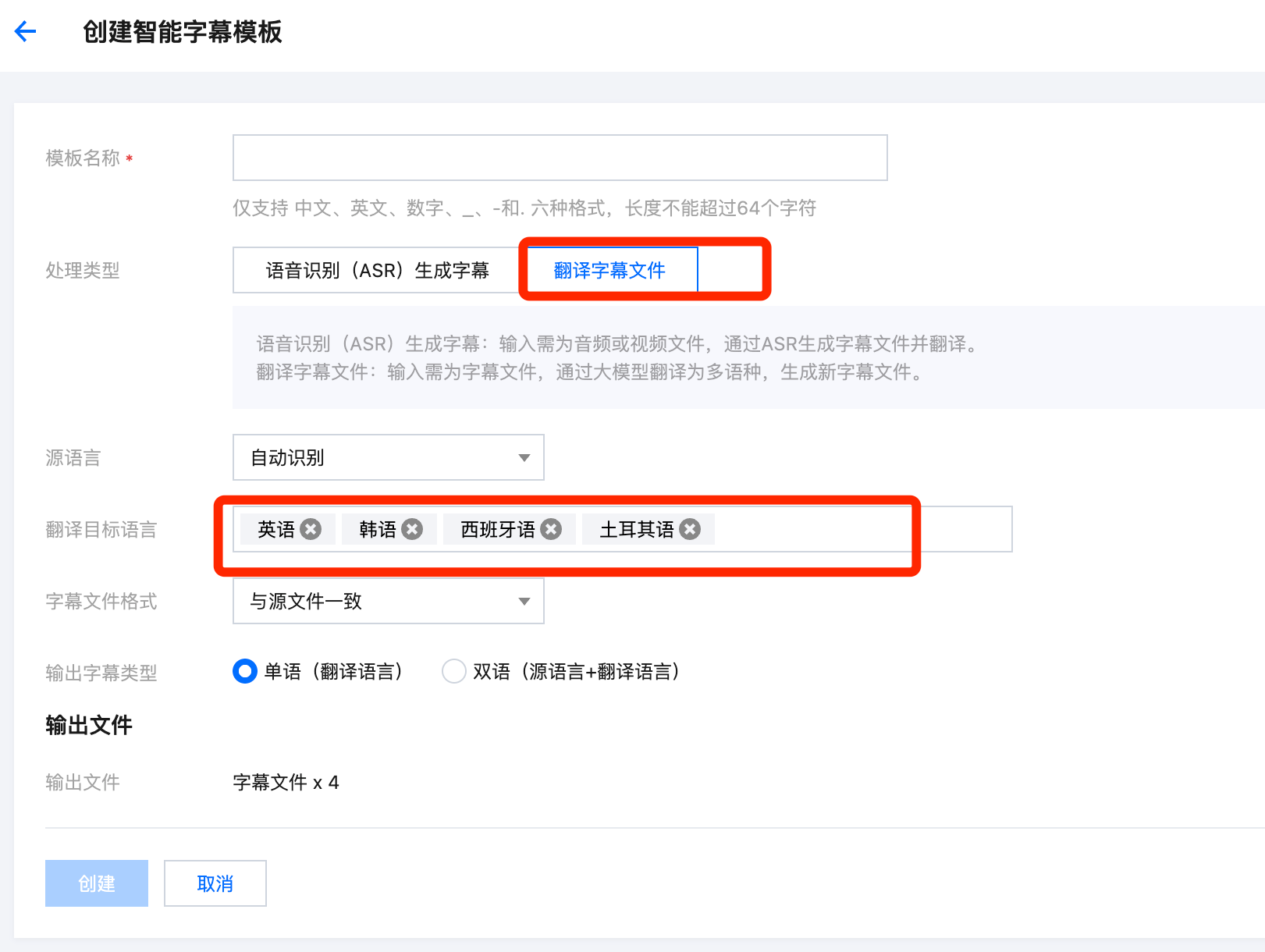 处理类型选择「翻译字幕文件」,并选择了 n 个翻译目标语言,将会收取 「翻译字幕」× 1 + 翻译字幕(附加语种)× (n-1) 费用。