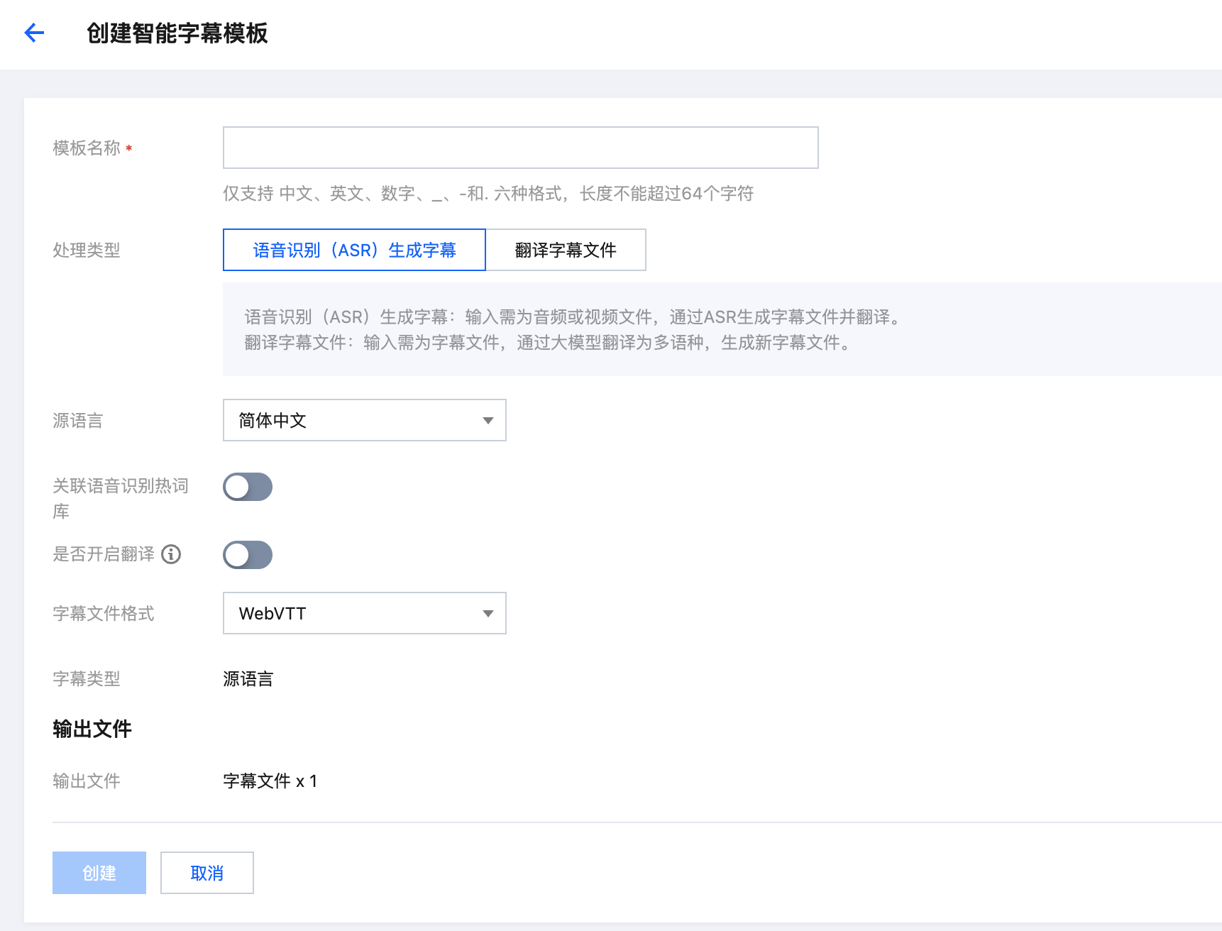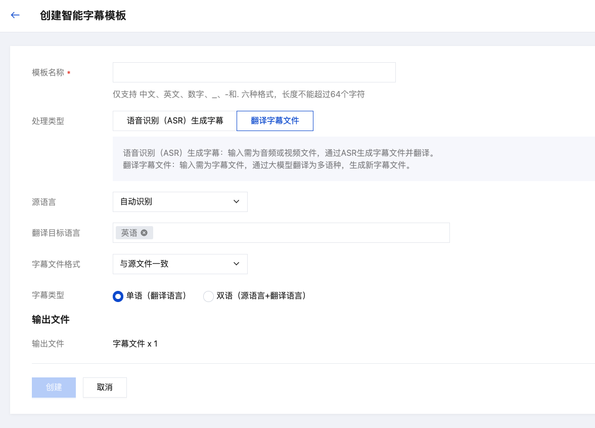 处理类型 | | 语音识别(ASR)生成字幕:输入需为音频或视频文件,通过 ASR 生成字幕文件并翻译。 翻译字幕文件:输入需为字幕文件,通过大模型翻译为多语种,生成新字幕文件。 |
