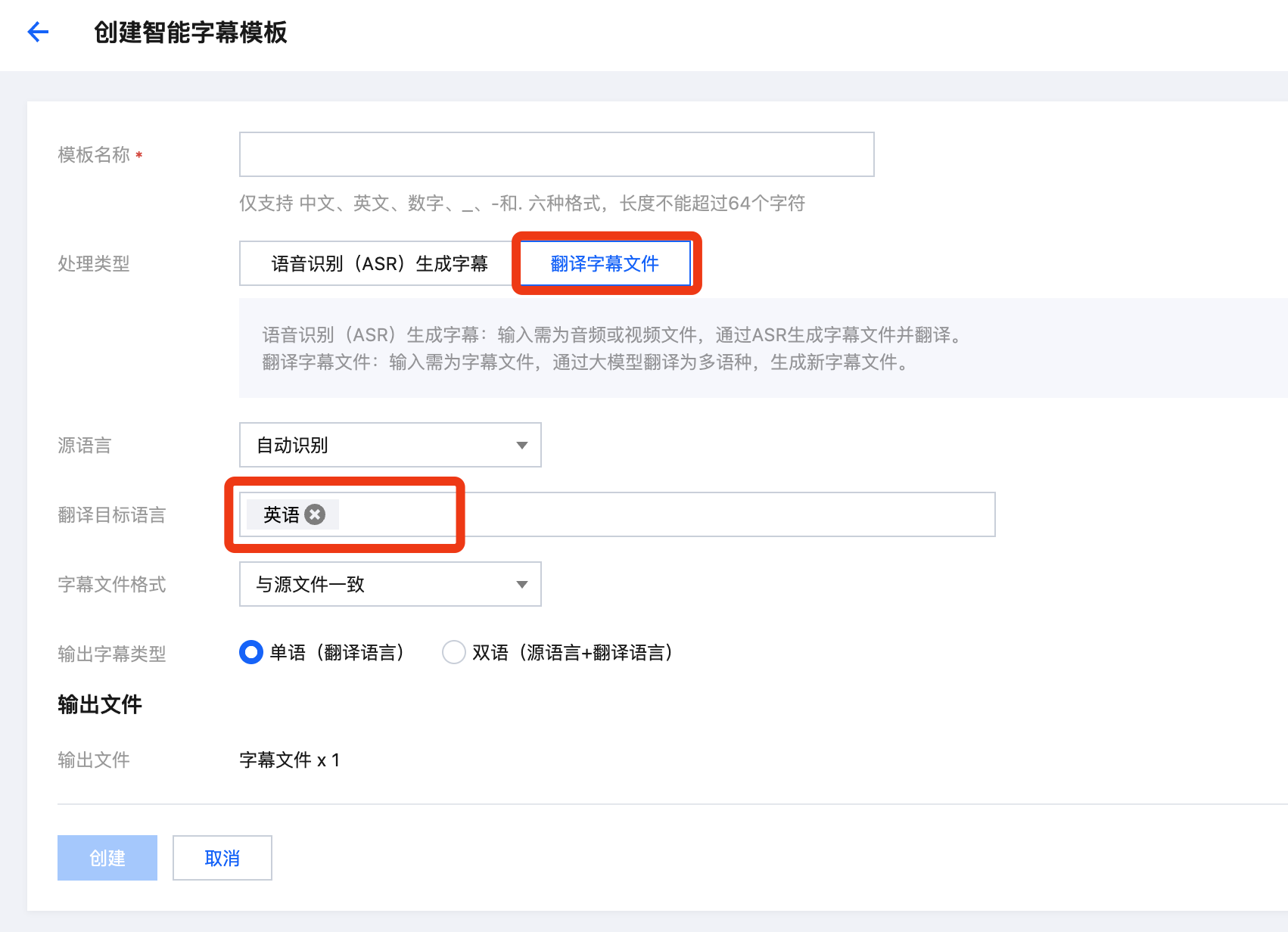 处理类型选择「翻译字幕文件」,并选择了一个翻译目标语言,将会收取「翻译字幕」费用,定价请参考 计费说明文档。