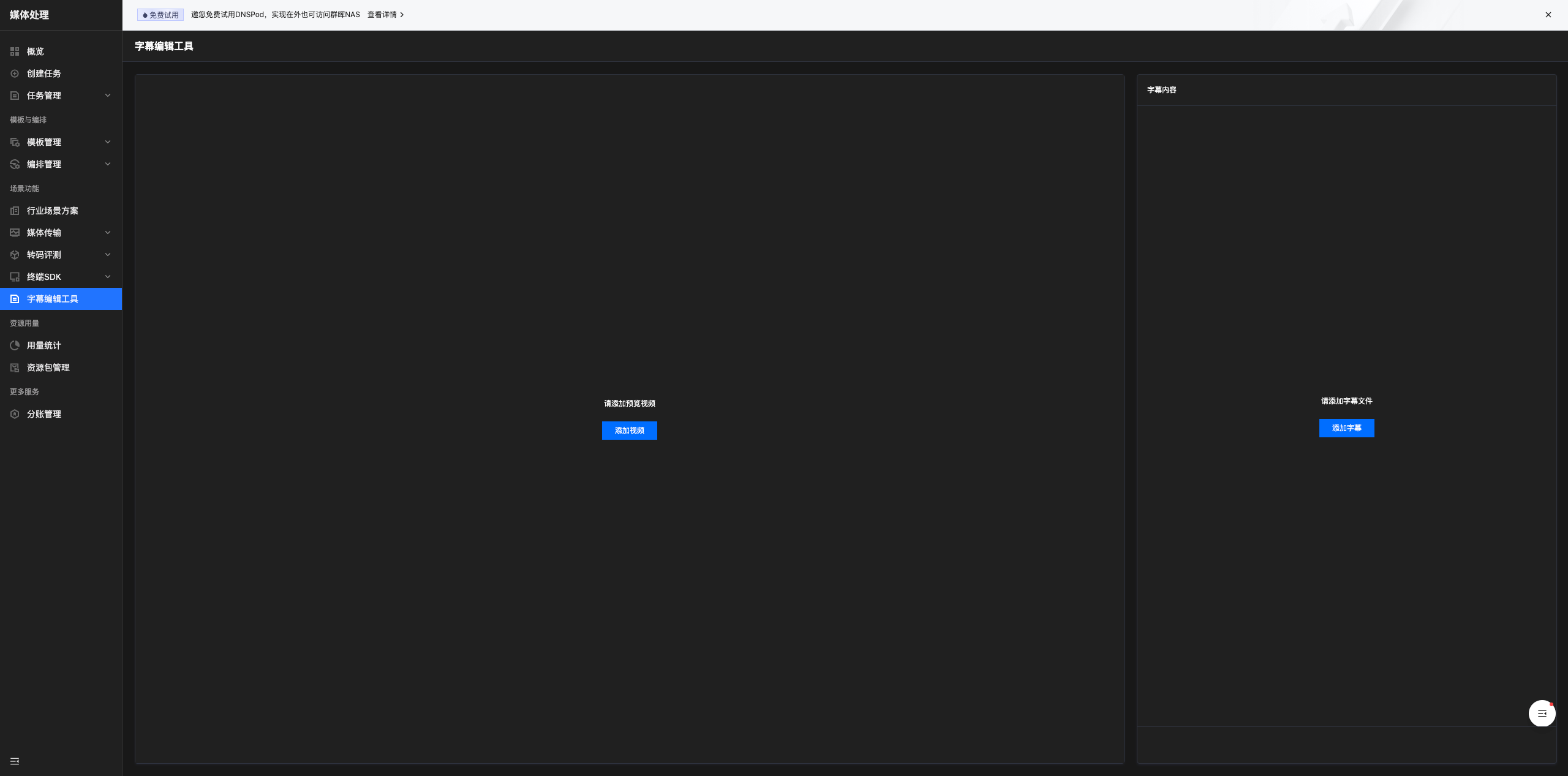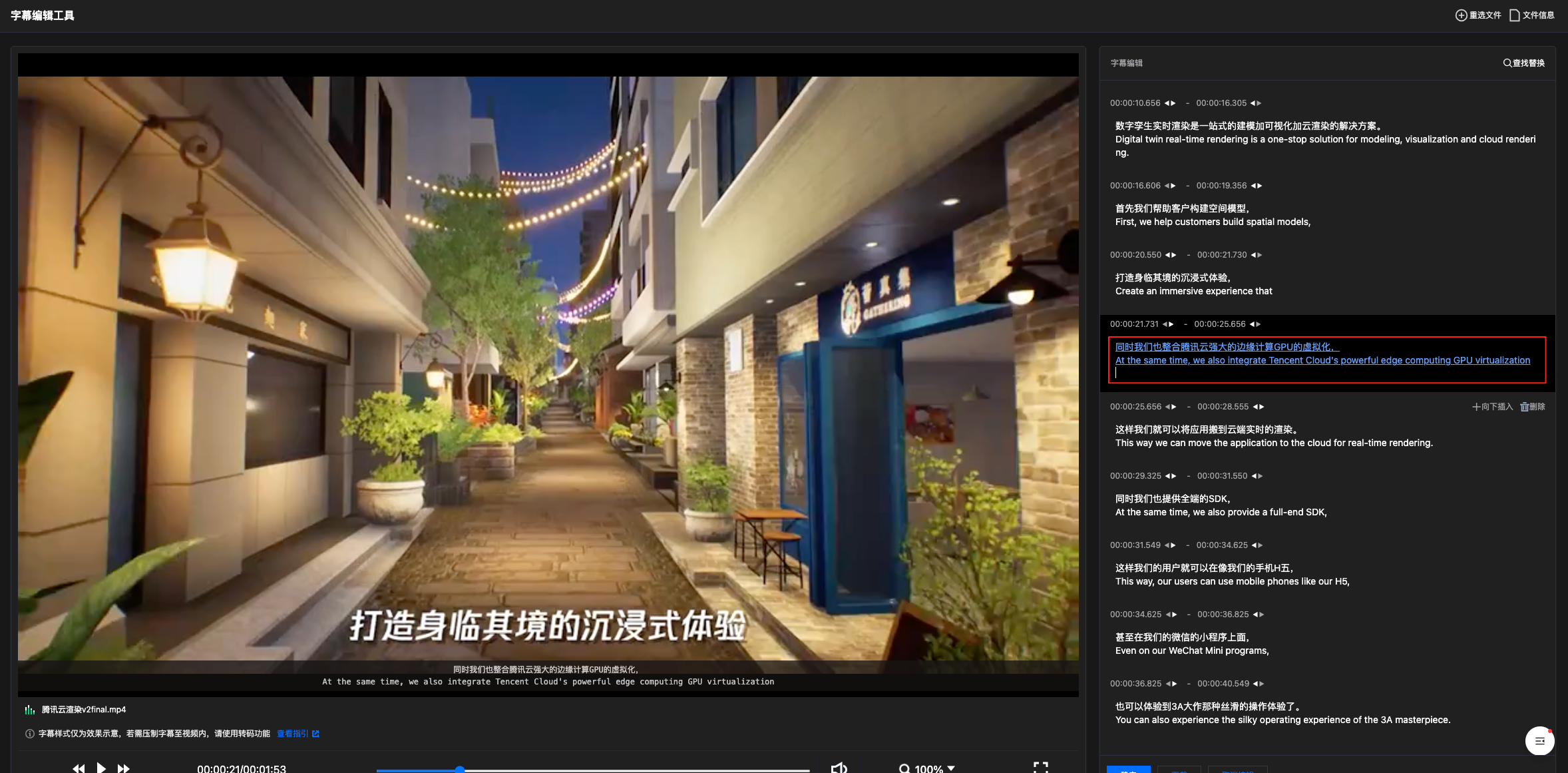 添加字幕文件后,单击编辑进入字幕编辑模式,支持对字幕文件的时间轴、字幕内容进行编辑。