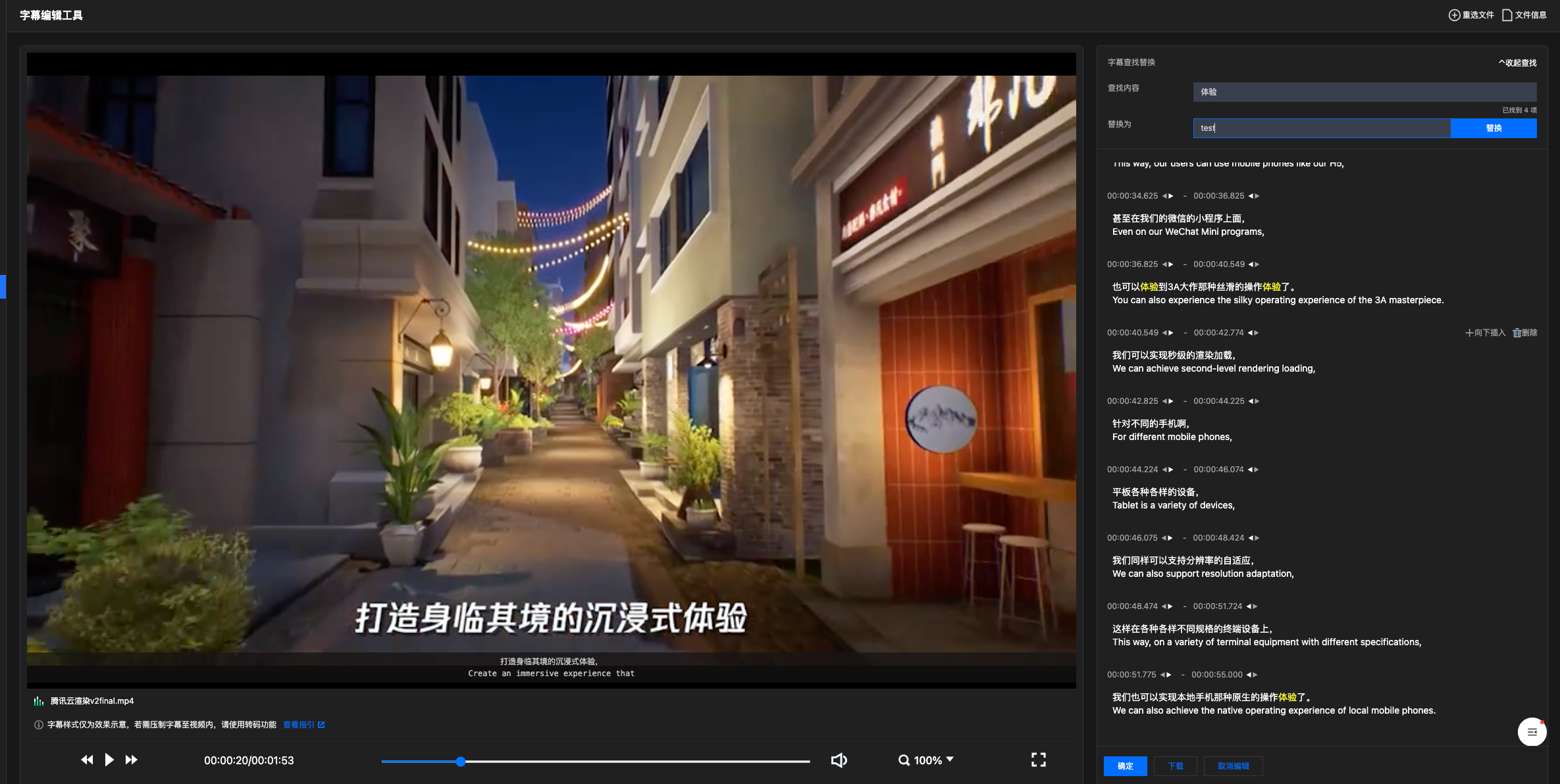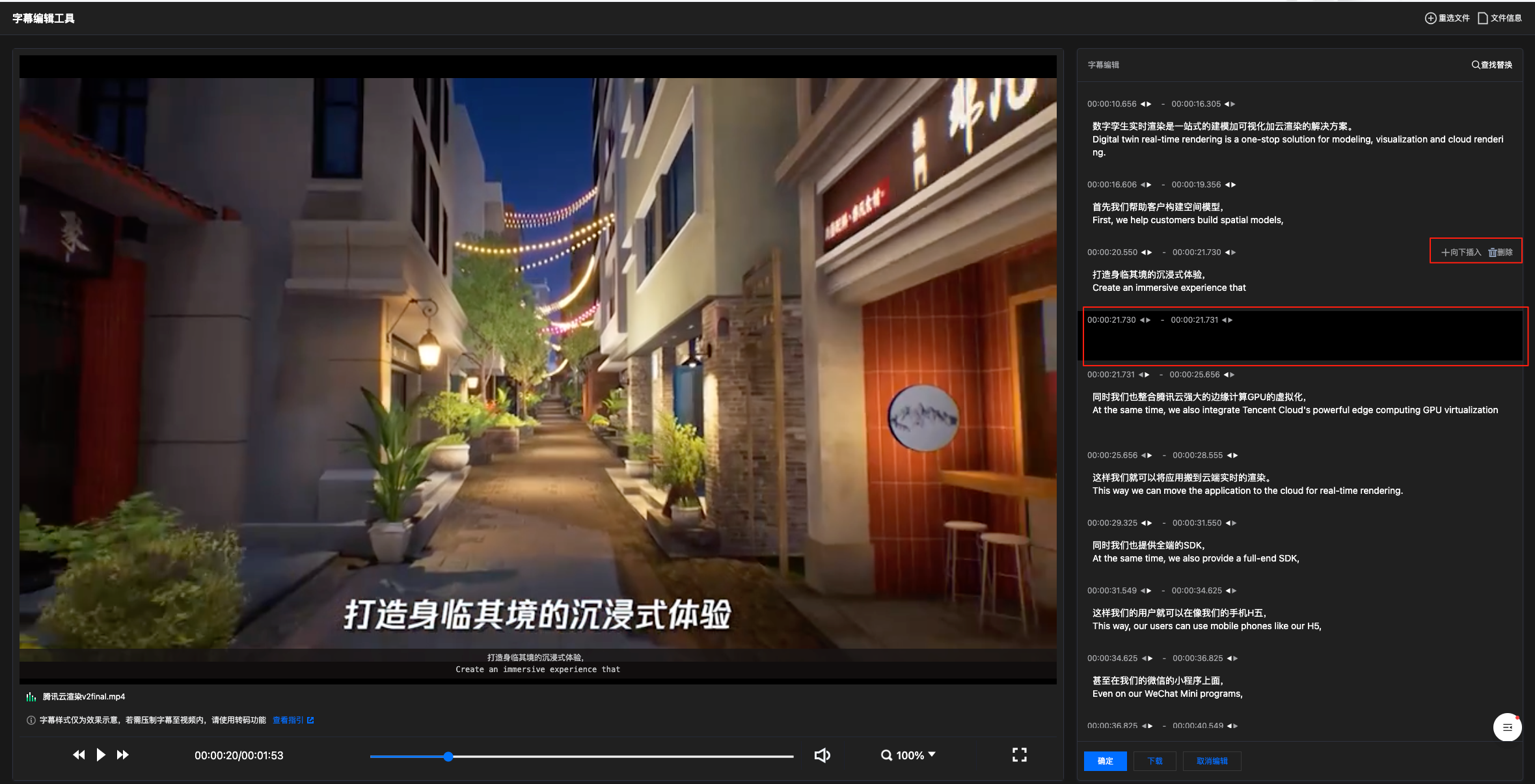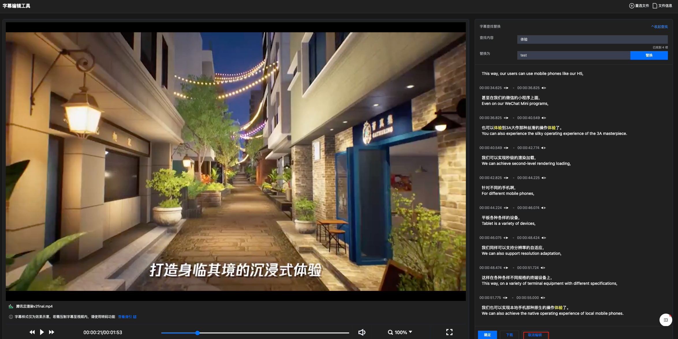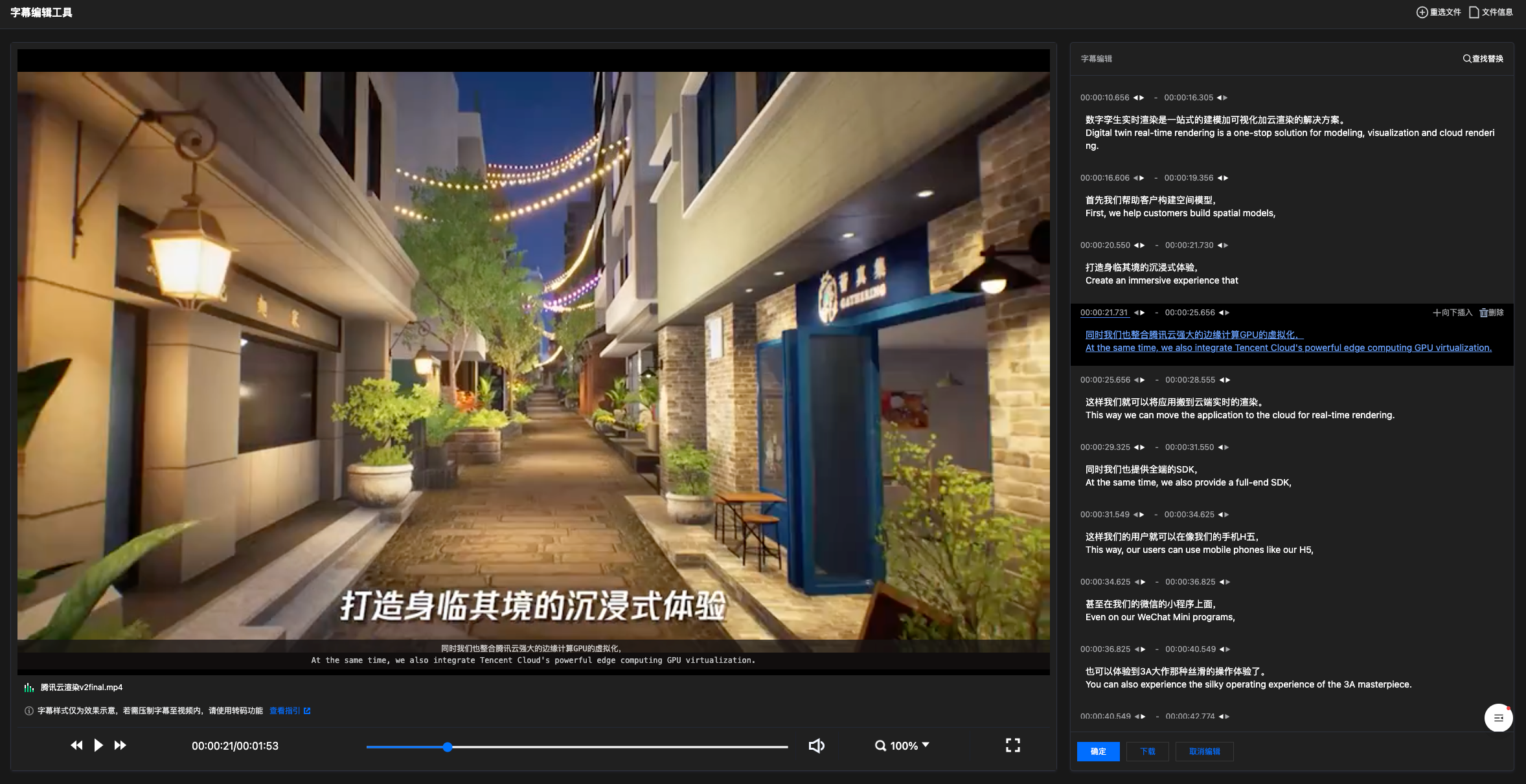 编辑完成后,单击确定保存更改。您可再次进入编辑状态进行修改或直接单击下载,将编辑后的字幕文件保存到本地。