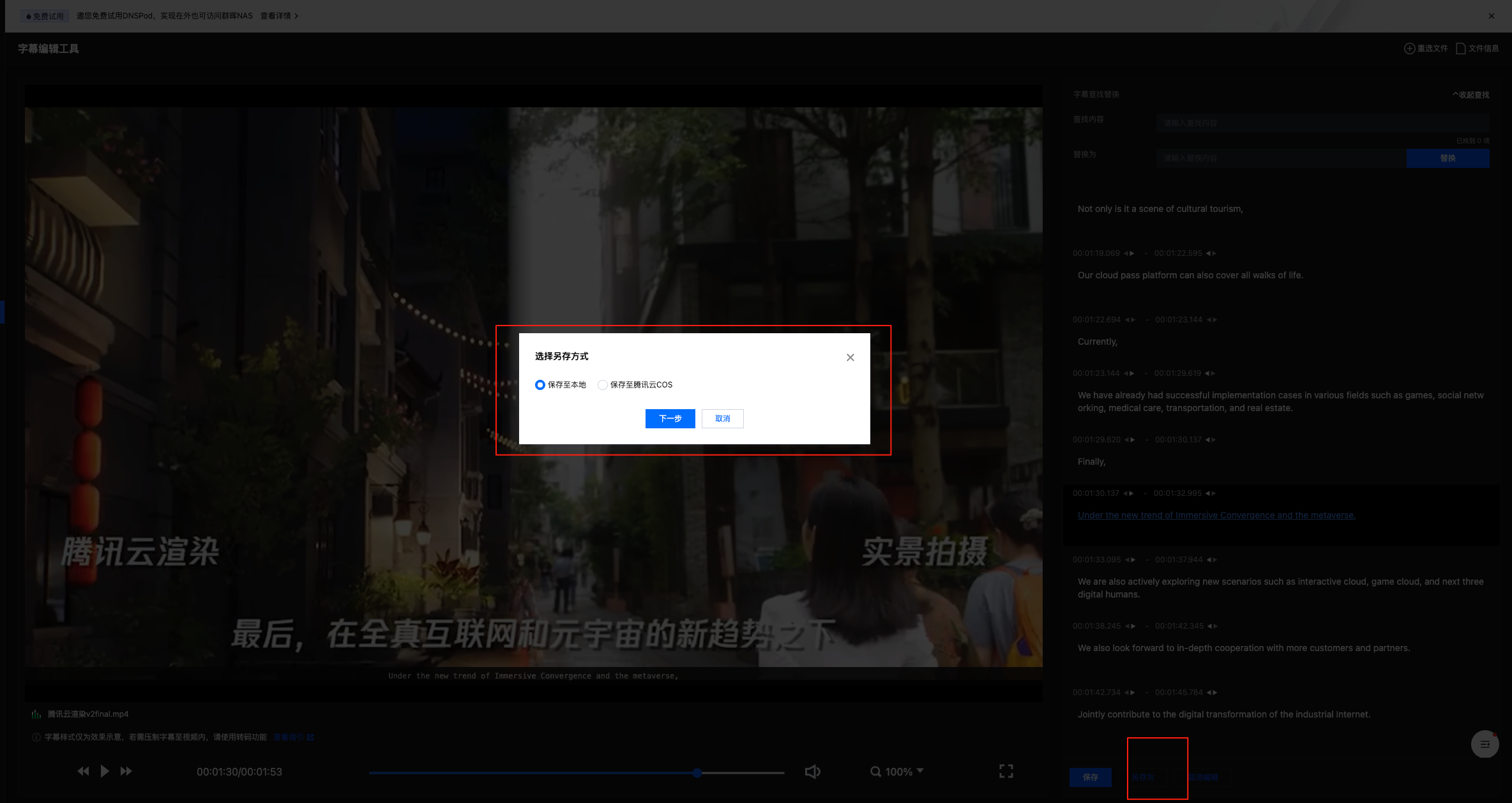 单击另存为,您可以选择将编辑后的字幕文件保存到本地或存储为 COS 中的一个新文件(不覆盖原文件)。