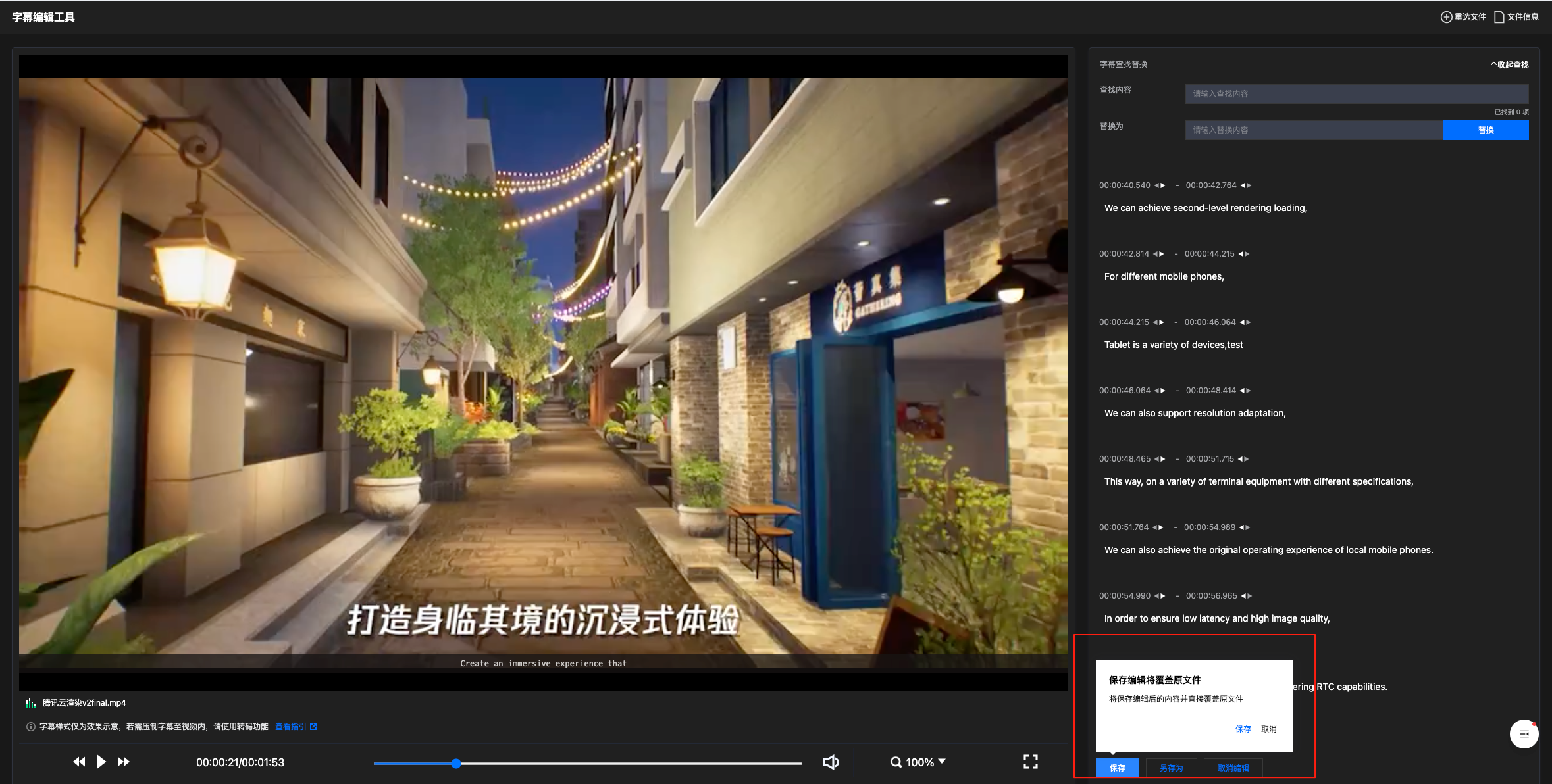 单击保存,将直接覆盖 COS 中的原始字幕文件。
