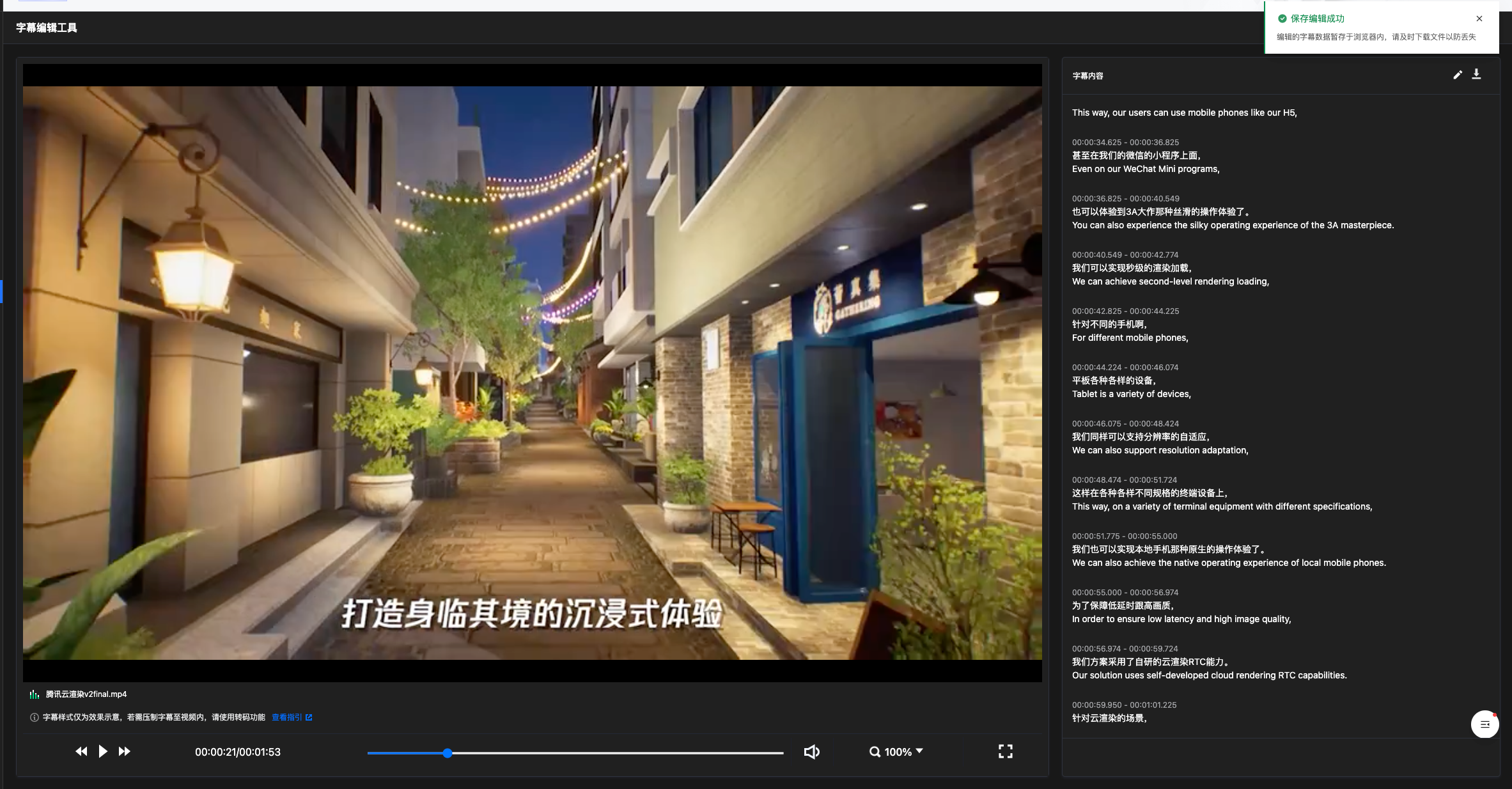 保存成功后,编辑的字幕数据会暂存于浏览器内。暂存数据在离开页面(关闭或刷新)时会丢失,请勿离开当前页面,建议您及时单击下载保存文件至本地。