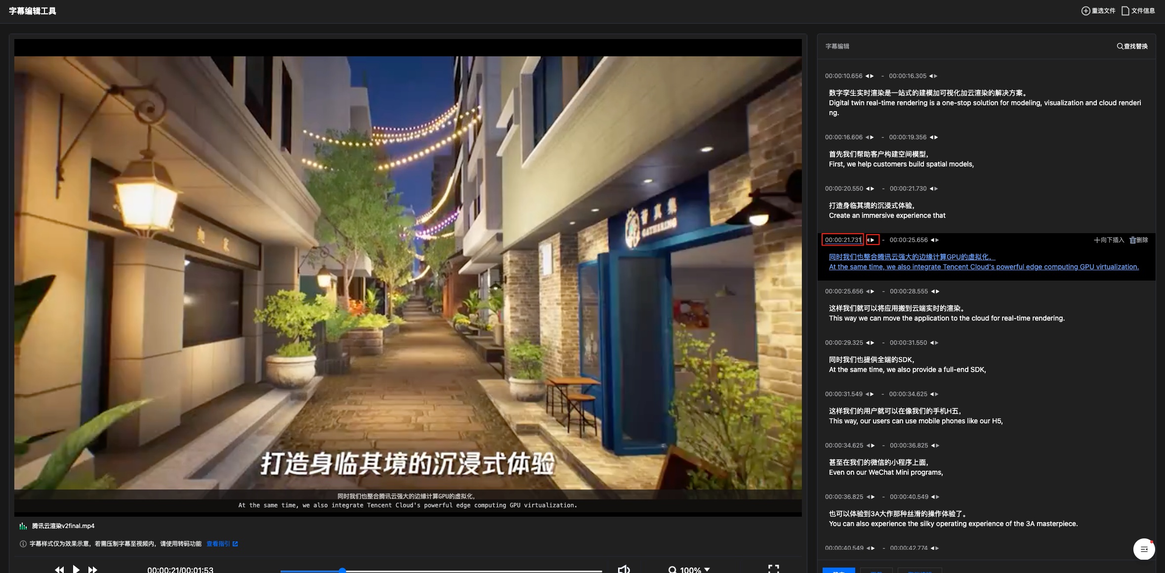 选中想要调整的字幕行,您可以单击按钮调整或手动输入精确的时间点调整该行字幕的开始和结束时间,保证字幕和视频内容精准对齐。