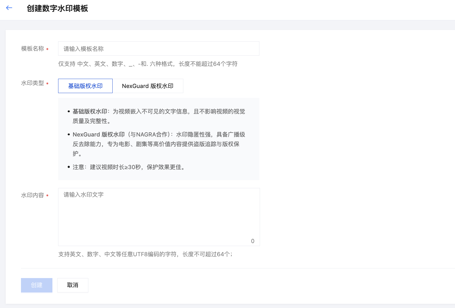 2. 单击创建数字水印模板,选择水印类型,输入模板名称和水印内容,即可创建数字水印模板。