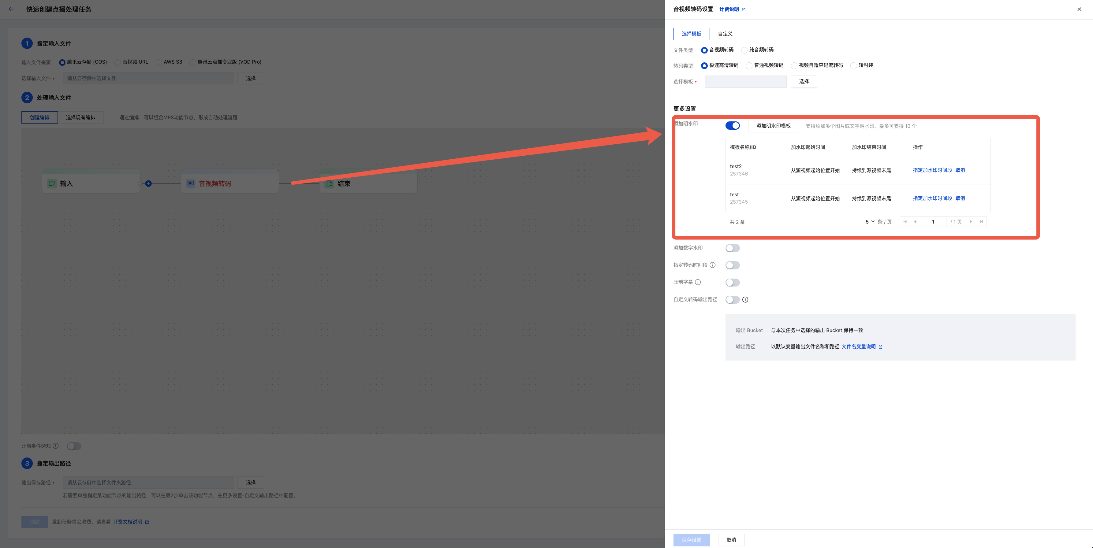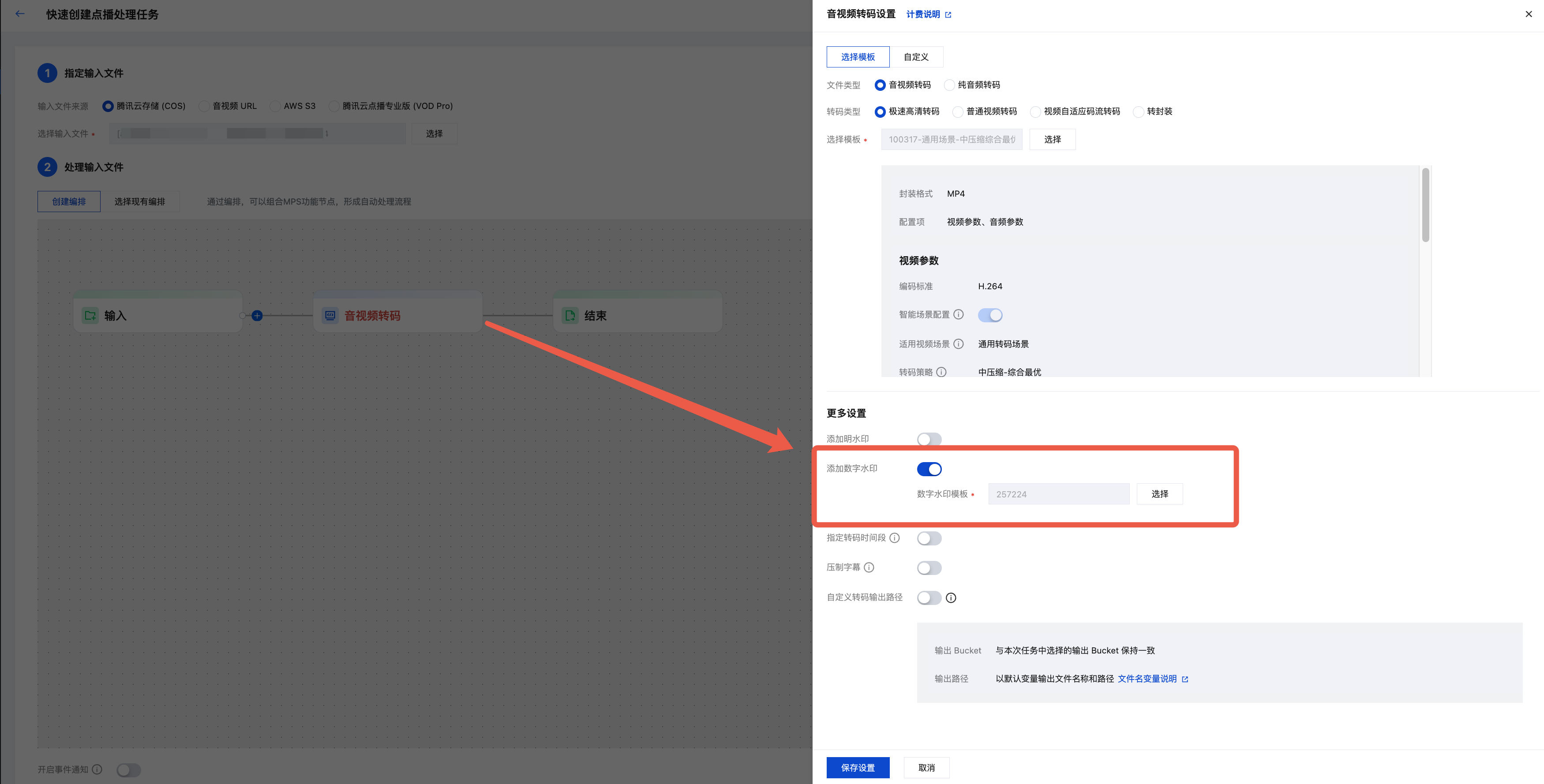 添加数字水印功能需依赖音视频转码功能。您可在发起转码任务时,通过关联数字水印模板来实现数字水印添加。