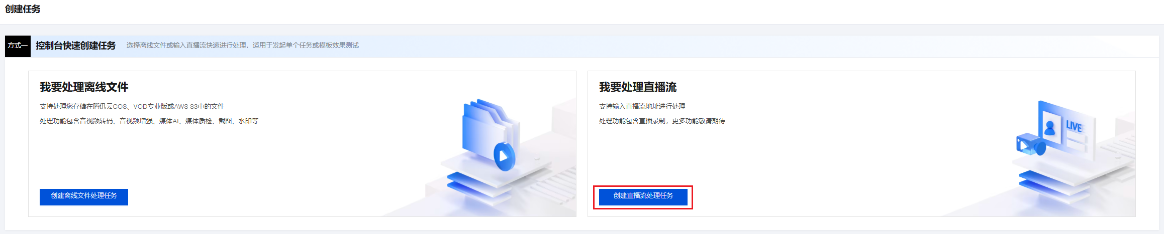 1. 进入 控制台创建任务页面,单击快速创建直播处理任务。