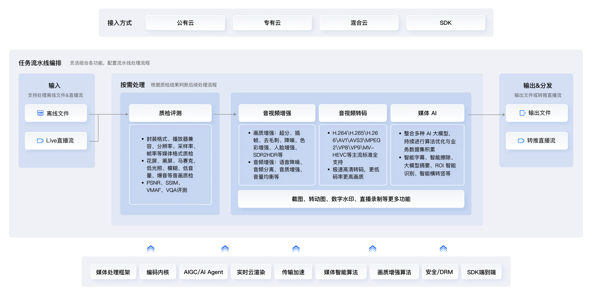 媒体处理(Media Processing Service,MPS)是智能、强大、全面的多媒体数据处理服务,行业支持最全面的音视频编码标准,基于自研编码内核和 AI 算法,提供音视频转码和增强、媒体智能及质检评测等能力。MPS 帮助您提高媒体质量、降低成本,并满足各类场景的音视频处理需求。