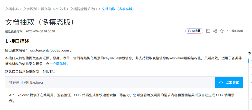 1. 腾讯云文字识别提供了丰富的demo体验,可以提前体验一下文档智能识别效果(文档智能提供基础版与多模态版选择):腾讯云文字识别 demo 体验。