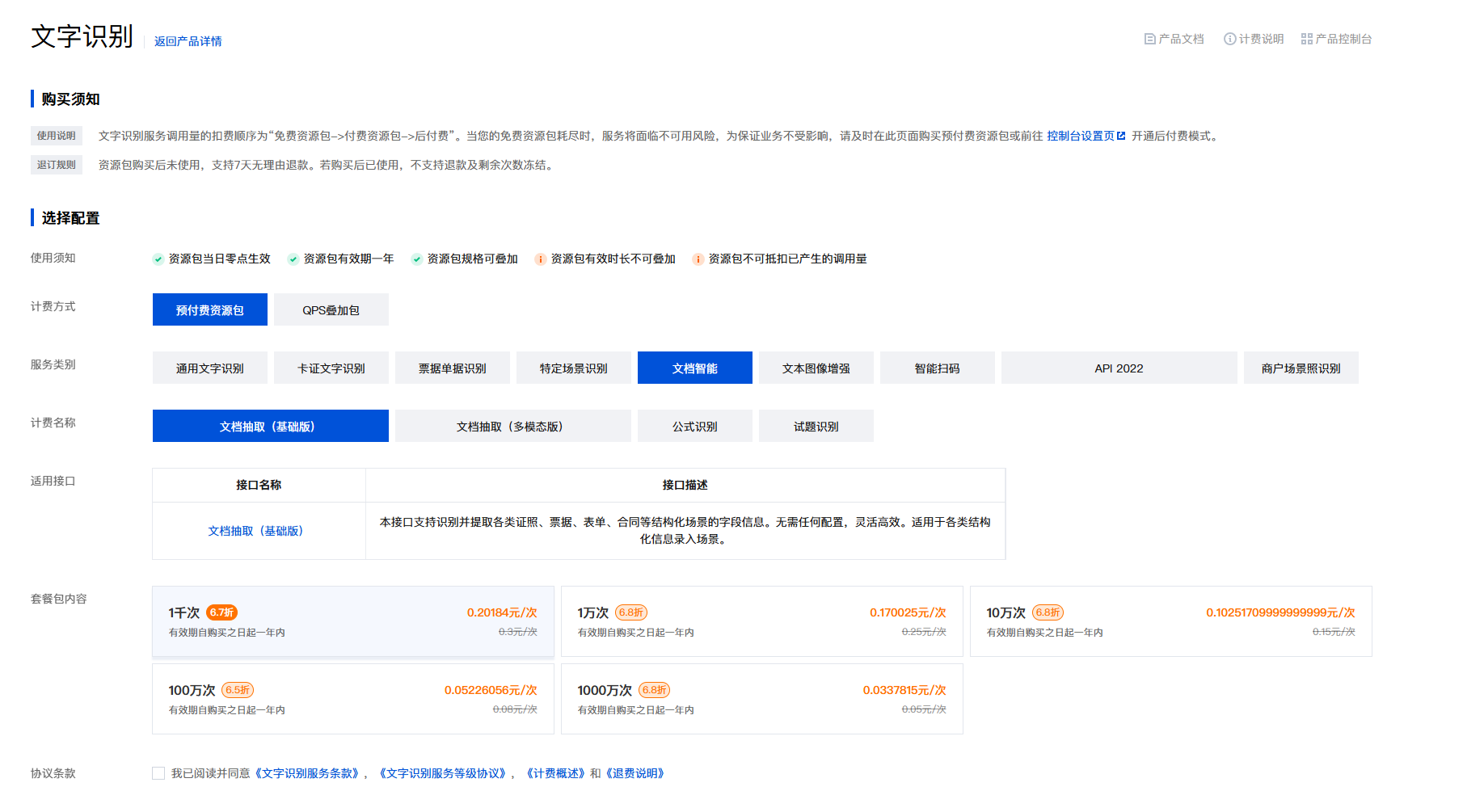 3. 服务开通成功后,腾讯云文字识别赠送了免费的资源包,其中文档抽取(多模态版)有1000次的免费额度,可以在 资源包管理页面 查看资源包使用情况。