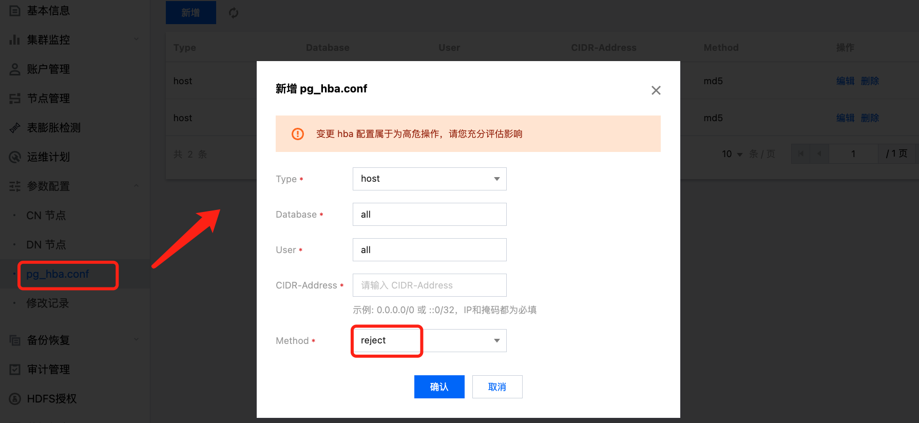 3. 单击新建,Method选择reject,根据需要输入数据库名、用户名和 CIDR 地址。