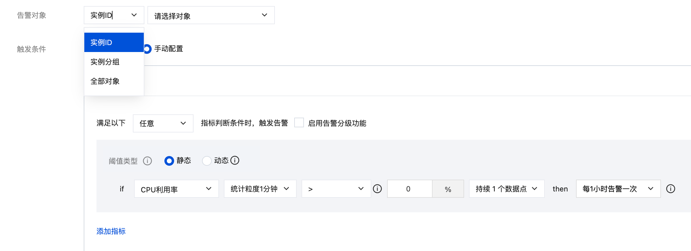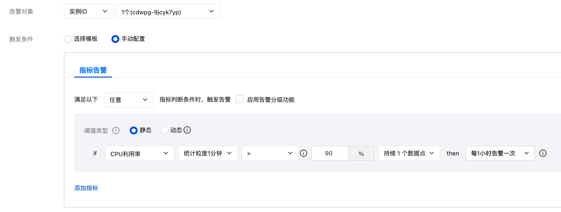 若选择手动配置,可自行增加需要关注的其他指标,通过设置阈值来为不同的指标设置不同的告警阈值以及告警通知的周期策略等。