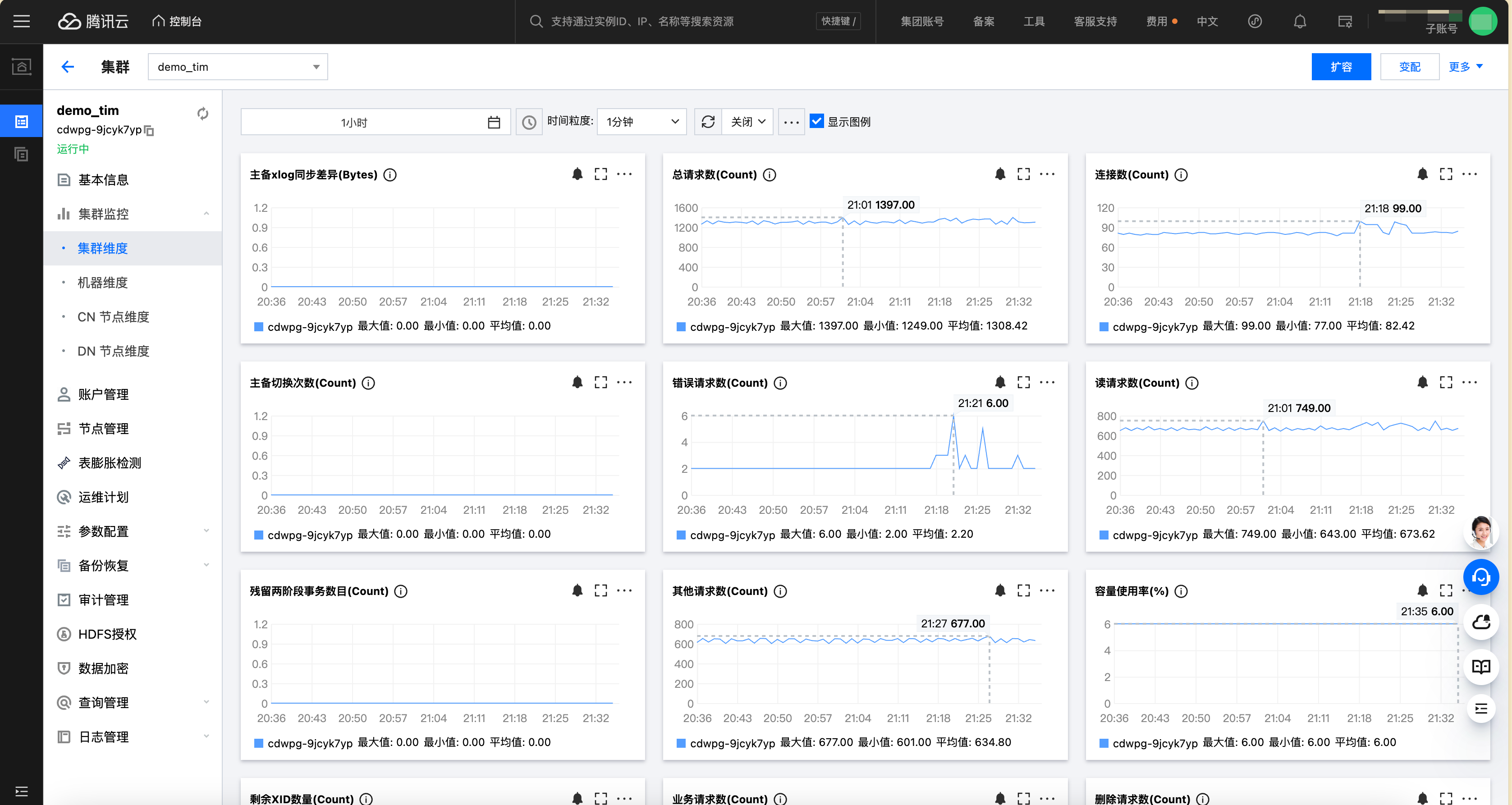 目前腾讯云数据仓库 TCHouse-P 提供了连接数、CPU 利用率、内存利用、网络接收吞吐量、网络输出吞吐量、写入 IOPS、读取 IOPS、磁盘空间使用率、读取吞吐量、写入吞吐量、读取延时、写入延时等指标。