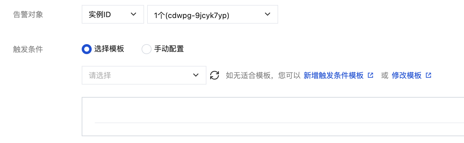 若选择触发条件:选择模板,可单击新增配置触发条件为每个指标配置告警触发的阈值,一旦该指标达到阈值满足条件后,系统将会向您发送告警信息。同时,也可单击修改模板修改已有模板。