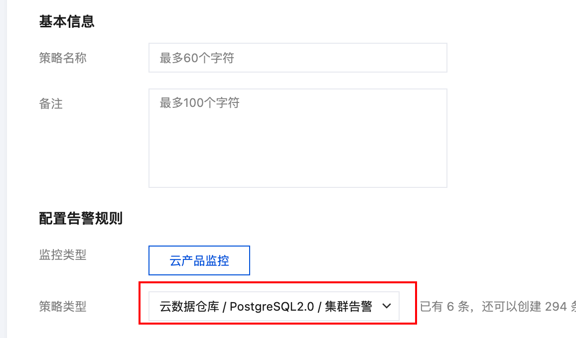 1. 选择策略类型为 云数据仓库-PostgreSQL2.0-集群告警。