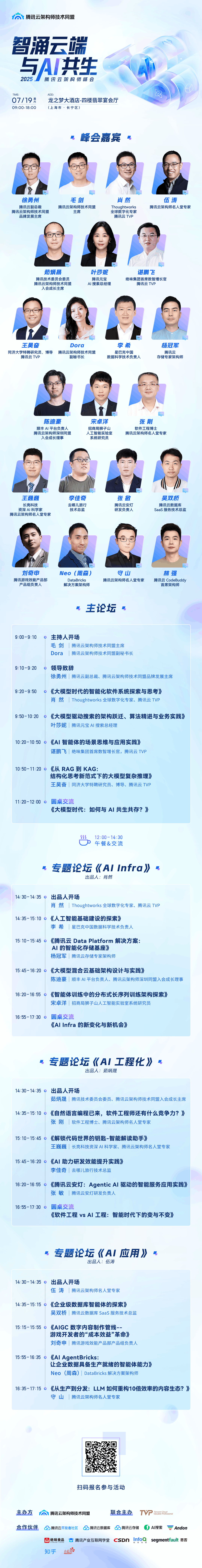 架构师正站在技术变革的最前沿。面对大模型等技术的快速演进,传统架构设计方法和思维难以应对复杂的业务需求和不断进化的技术栈。智能时代,架构师如何与 AI 共同进化,寻找更多未来发展机遇?7月19日,由腾讯云架构师技术同盟与腾讯云 TVP 联合主办的「智涌云端,与 AI 共生」2025 腾讯云架构师峰会,将在上海梦之龙大酒店 · 四楼翡翠宴会厅举行。峰会齐聚数十位企业领袖、技术管理者、资深架构师、高校学者等重磅嘉宾,围绕 AI 基础设施、工程化落地、AI 应用等热门话题展开,通过前沿架构技术解读、真实案例解析,产学研跨界互动讨论等,探索架构师与 AI 共同进化路径,助力架构师提升竞争力。