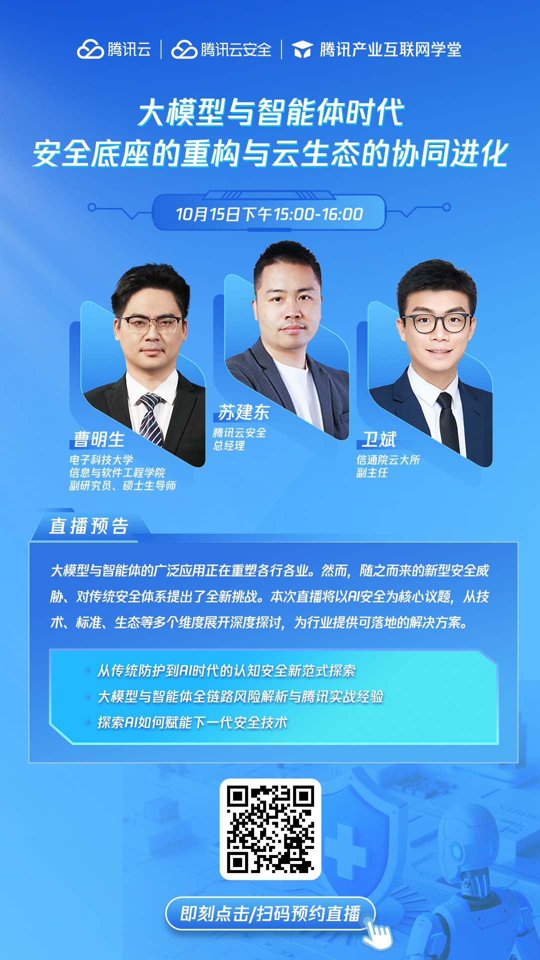 10月15日(周三)15:00-16:00,腾讯云联合中国信通院、电子科技大学发起的“大模型与智能体时代安全底座的重构与云生态的协同进化”行业对话将在腾讯安全视频号线上开讲!