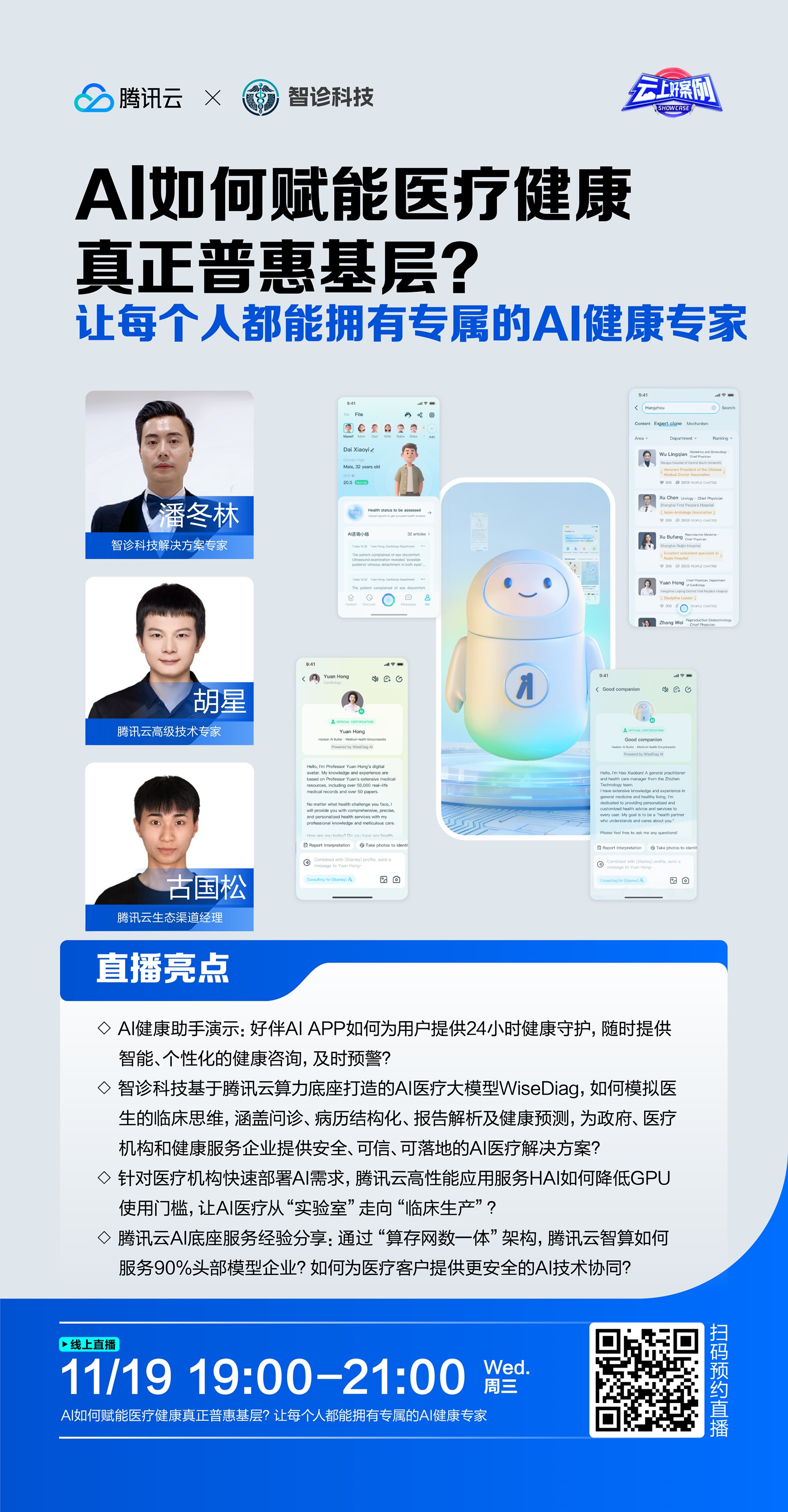 本期直播,腾讯云医疗科技企业客户、技术大咖将会分享AI赋能医疗健康的落地经验,分享: