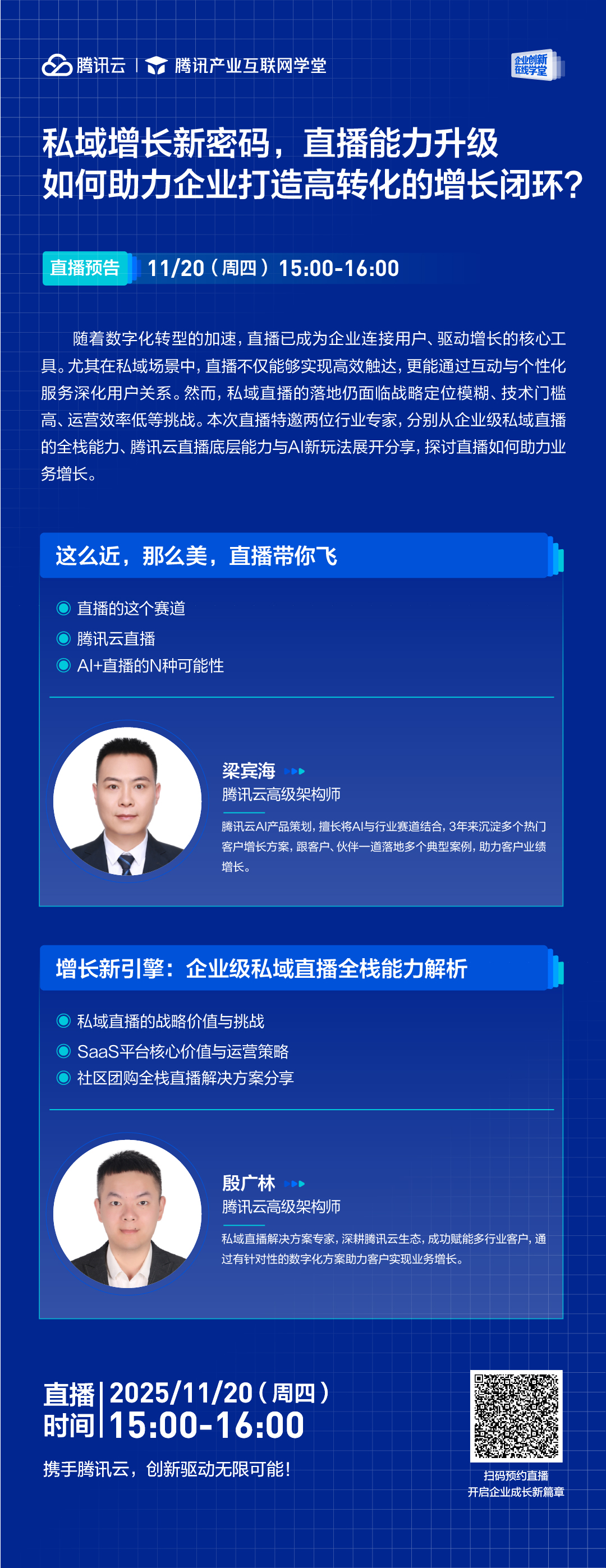 随着数字化转型的加速,直播已成为企业连接用户、驱动增长的核心工具。尤其在私域场景中,直播不仅能够实现高效触达,更能通过互动与个性化服务深化用户关系。然而,私域直播的落地仍面临战略定位模糊、技术门槛高、运营效率低等挑战。本次直播特邀两位行业专家,分别从企业级私域直播的全栈能力、腾讯云直播底层能力与AI新玩法展开分享,探讨直播如何助力业务增长。