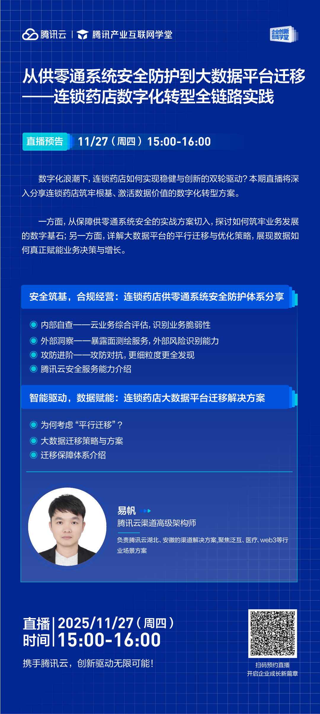 数字化浪潮下,连锁药店如何实现稳健与创新的双轮驱动?本期直播将深入分享连锁药店筑牢根基、激活数据价值的数字化转型方案。一方面,从保障供零通系统安全的实战方案切入,探讨如何筑牢业务发展的数字基石;;另一方面,详解大数据平台的平行迁移与优化策略,展现数据如何真正赋能业务决策与增长。