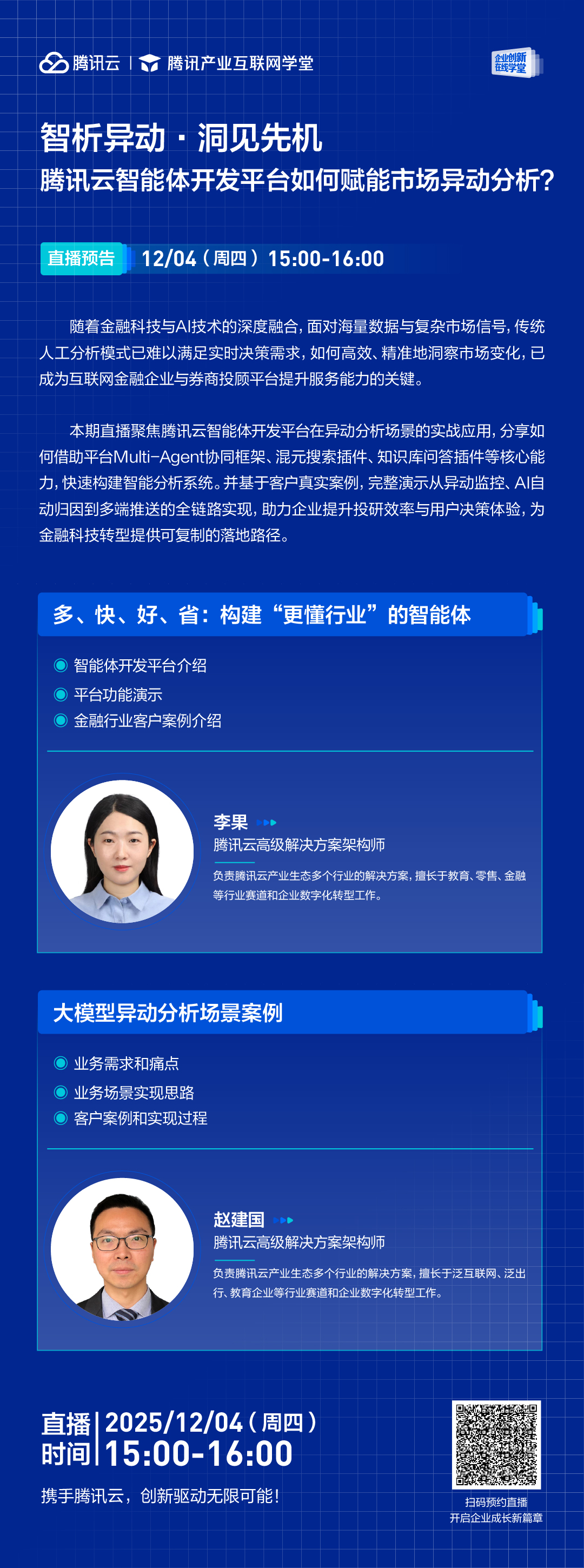 随着金融科技与AI技术的深度融合,面对海量数据与复杂市场信号,传统人工分析模式已难以满足实时决策需求,如何高效、精准地洞察市场变化,已成为互联网金融企业与券商投顾平台提升服务能力的关键。本期直播聚焦腾讯云智能体开发平台在异动分析场景的实战应用,分享如何借助平台Multi-Agent协同框架、混元搜索插件、知识库问答插件等核心能力,快速构建智能分析统。并基于客户真实案例,完整演示从异动监控、AI自动归因到多端推送的全链路实现,助力企业提升投研效率与用户决策体验,为金融科技转型提供可复制的落地路径。