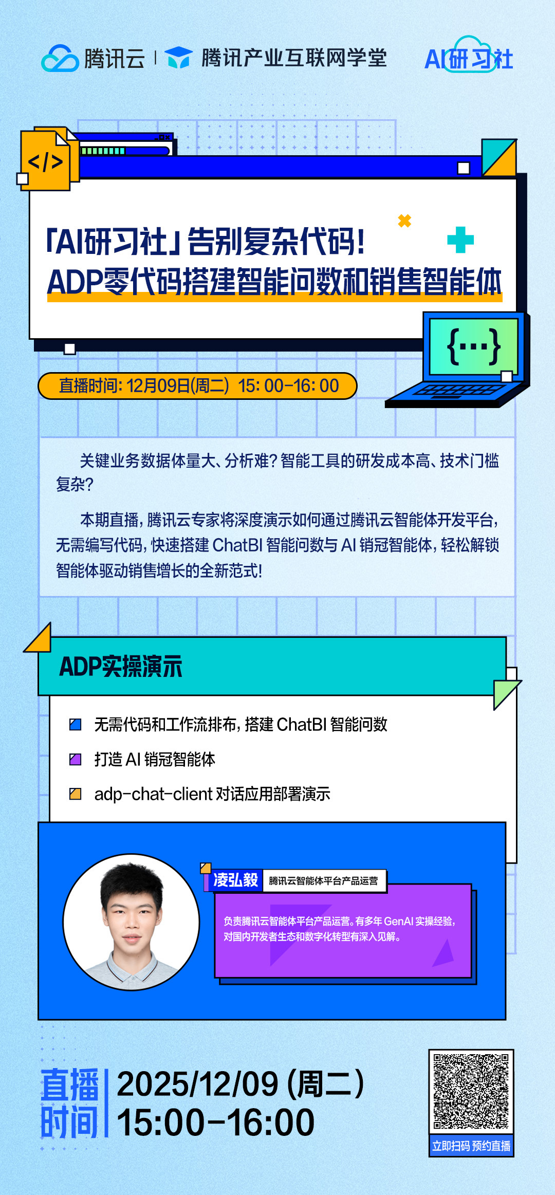 关键业务数据体量大、分析难?智能工具的研发成本高、技术门槛复杂?本期直播,腾讯云专家将深度演示如何通过腾讯云智能体开发平台无需编写代码,快速搭建ChatBl智能问数与Al销冠智能体,轻松解锁智能体驱动销售增长的全新范式!