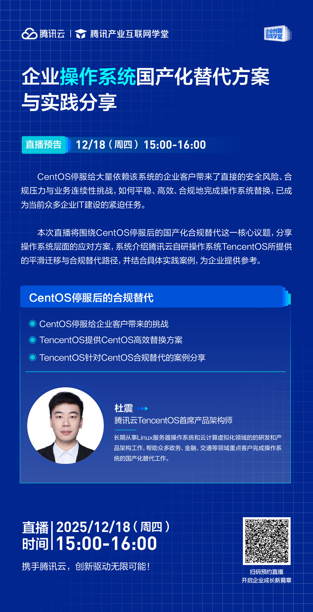 CentOS停服给大量依赖该系统的企业客户带来了直接的安全风险、合规压力与业务连续性挑战,如何平稳、高效、合规地完成操作系统替换,已成为当前众多企业IT建设的紧迫任务。本次直播将围绕CentOS停服后的国产化合规替代这一核心议题,分享操作系统层面的应对方案,系统介绍腾讯云自研操作系统TencentOS所提供的平滑迁移与合规替代路径,并结合具体实践案例,为企业提供参考。