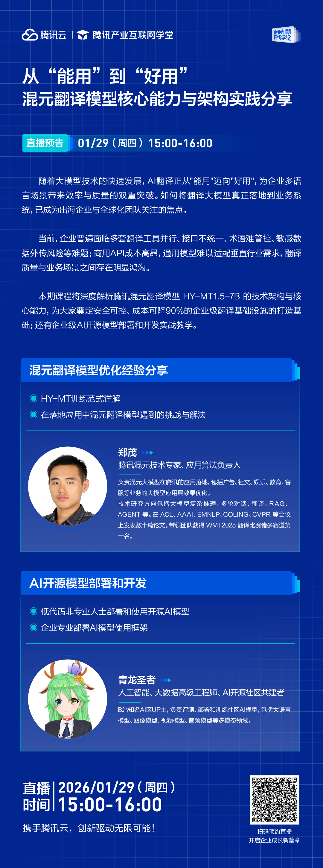 随着大模型技术的快速发展,AI翻译正从"能用"迈向"好用",为企业多语言场景带来效率与质量的双重突破。如何将翻译大模型真正落地到业务系统,已成为出海企业与全球化团队关注的焦点。当前,企业普遍面临多套翻译工具并行、接口不统一、术语难管控、敏感数据外传风险等难题;商用API成本高昂,通用模型难以适配垂直行业需求,翻译质量与业务场景之间存在明显鸿沟。本期课程将深度解析腾讯混元翻译模型 HY-MT1.5-7B 的技术架构与核心能力,为大家奠定安全可控、成本可降90%的企业级翻译基础设施的打造基础;还有企业级AI开源模型部署和开发实战教学。