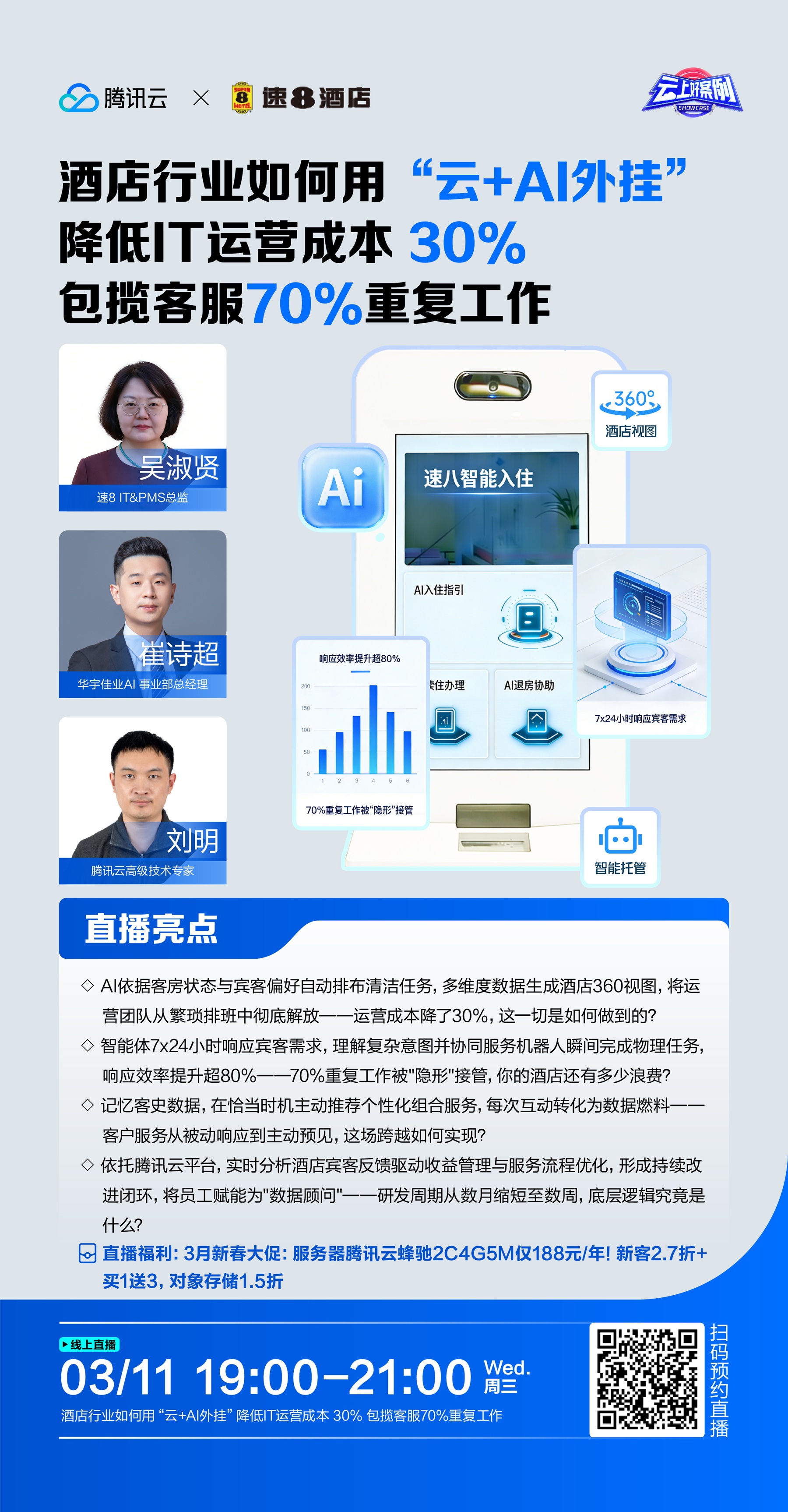 腾讯云助力速8酒店实现智能化变革:运营成本降30%,AI客服覆盖70%重复工作,预见式服务提升顾客体验,研发周期缩短一半。腾讯云技术专家与成功客户,为您揭秘AI在酒店行业的前沿落地经验,共创价值增长