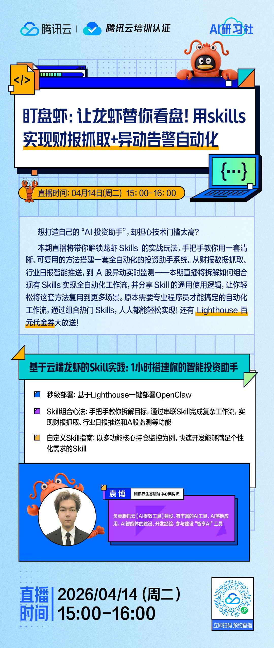 想打造自己的“AI投资助手”,却担心技术门槛太高?本期直播将带你解锁龙虾 Skills 的实战玩法,手把手教你用一套清晰、可复用的方法搭建一套全自动化的投资助手系统。从财报数据抓取、行业日报智能推送,到 A 股异动实时监测——本期直播将拆解如何组合现有 Skills 实现全自动化工作流,并分享 Skills 的通用使用逻辑,让你轻松将这套方法复用到更多场景。原本需要专业程序员才能搞定的自动化工作流,通过组合热门 Skills,人人都能轻松实现!还有 Lighthouse 百元代金券大放送!