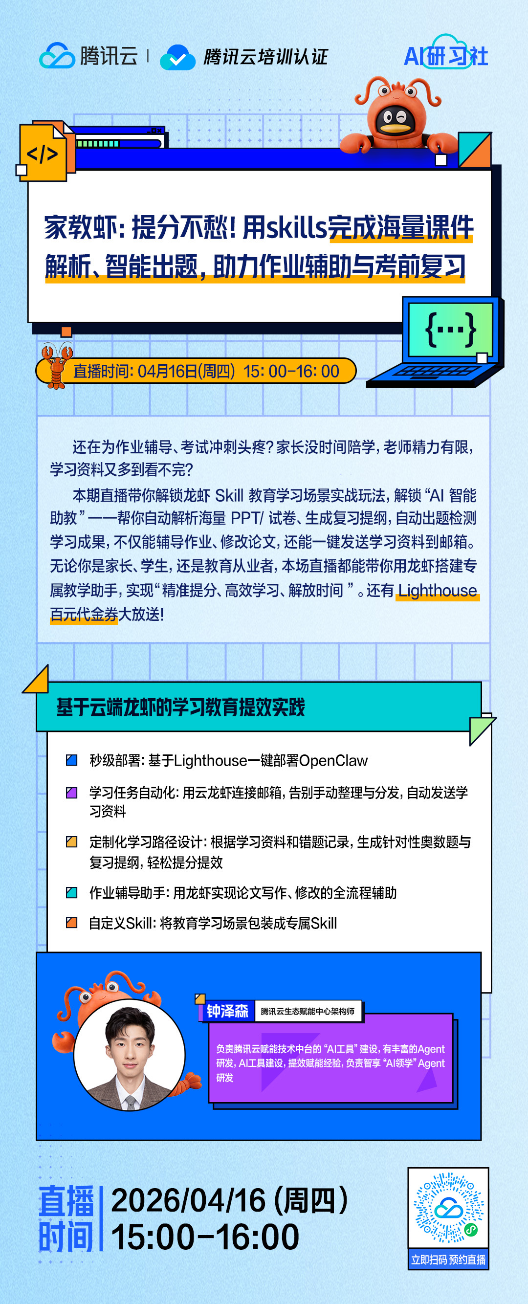 还在为作业辅导、考试冲刺头疼?家长没时间陪学,老师精力有限,学习资料又多到看不完?本期直播带你解锁龙虾 Skills 教育学习场景实战玩法,解锁“AI 智能助教”——帮你自动解析海量 PPT/ 试卷、生成复习提纲,自动出题检测学习成果,不仅能辅导作业、修改论文,还能一键发送学习资料到邮箱。无论你是家长、学生,还是教育从业者,本场直播都能带你用龙虾搭建专属教学助手,实现“精准提分、高效学习、解放时间”。还有 Lighthouse百元代金券大放送!
