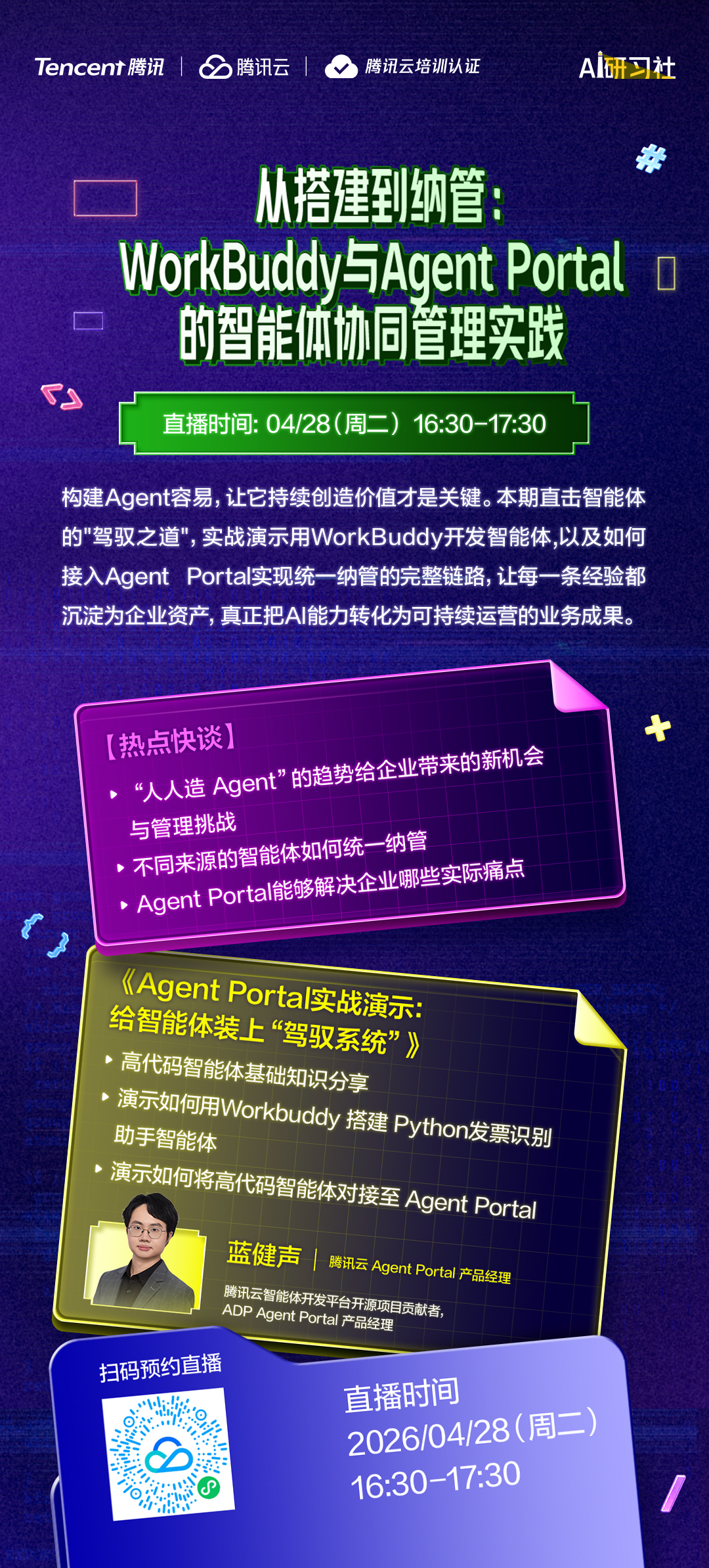 构建Agent容易,让它持续创造价值才是关键。本期直击智能体的“驾驭之道",实战演示用WorkBuddy开发智能体,以及如何接入Agent Portal实现统一纳管的完整链路,让每一条经验都沉淀为企业资产,真正把AI能力转化为可持续运营的业务成果,