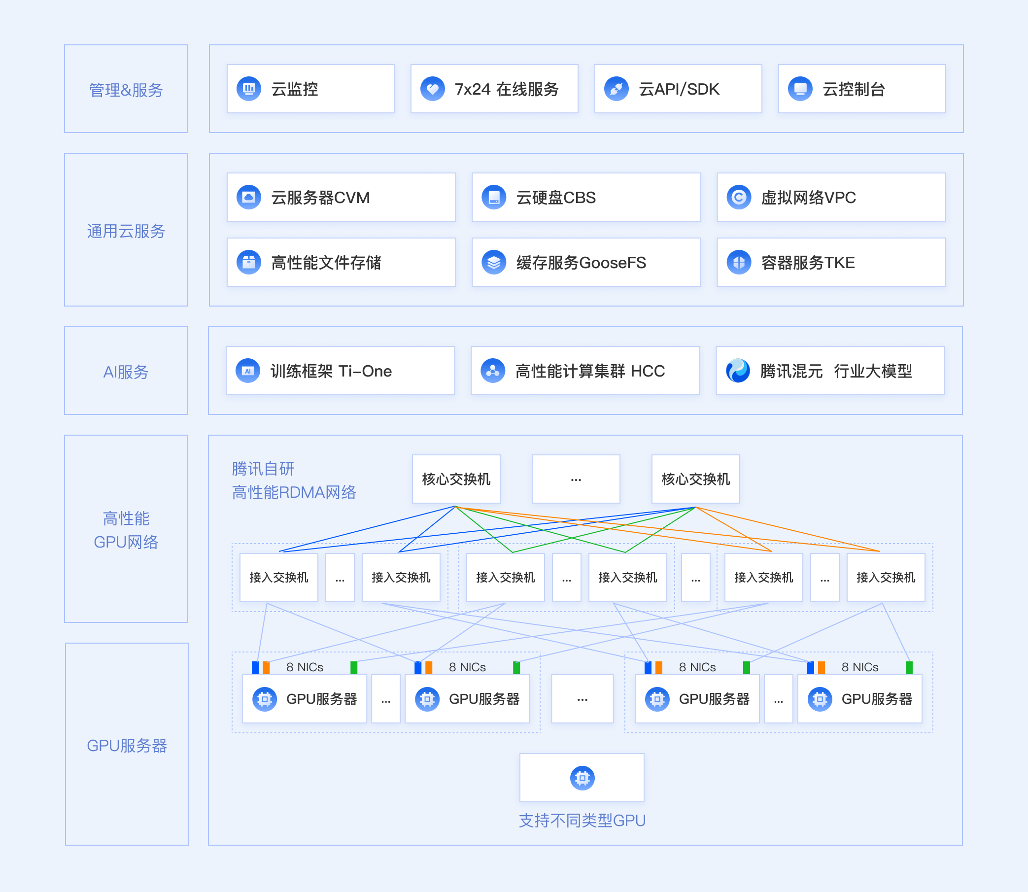 本地大模型算力集群场景是在客户本地 IDC 内构建专属的、用于 AI 大模型训练与推理的基础设施环境,满足企业数据合规、安全或低延迟需求。腾讯云CDC提供整套高性能GPU算力解决方案,配套腾讯自研RDMA高性能网络、Ti-One训练框架、HCC高性能计算集群,以及腾讯混元行业大模型能力,为客户提供完整的生态服务。