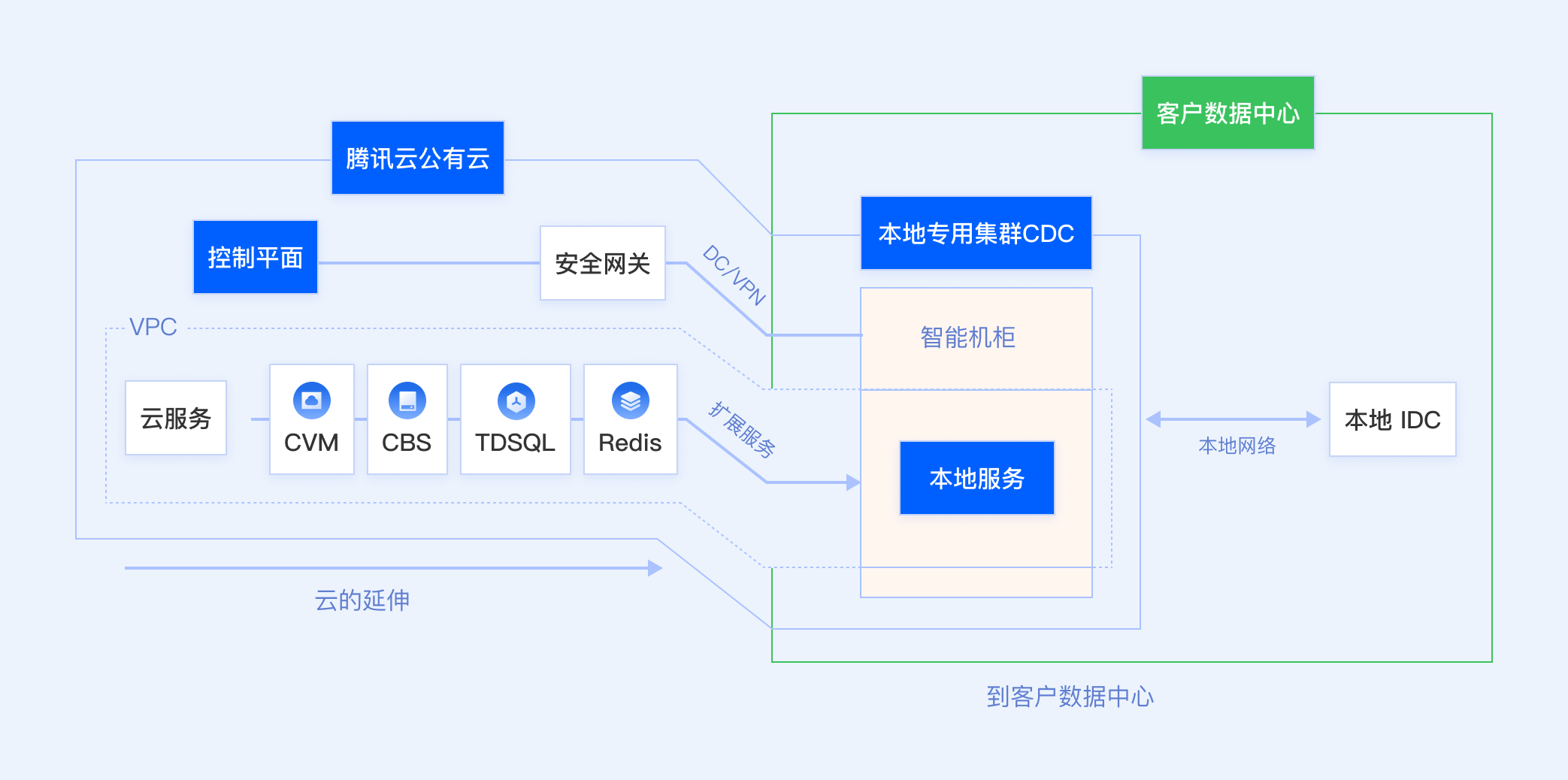 腾讯云CDC将经过海量业务验证的腾讯云公有云能力,通过智能机架的形式部署到客户本地数据中心。客户无需改变现有使用习惯,即可在本地享受与腾讯云公有云完全一致的产品体验、API接口和运维服务。
