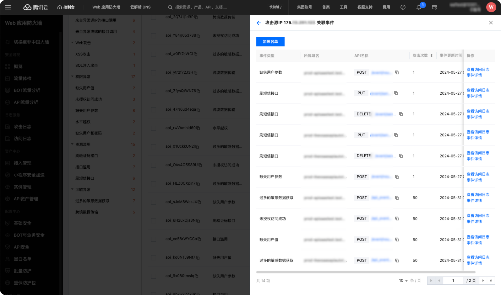 4、【优化】优化事件管理中API事件详情展示,增加攻击源IP关联事件视角,针对攻击源快速盘点影响面并处置。