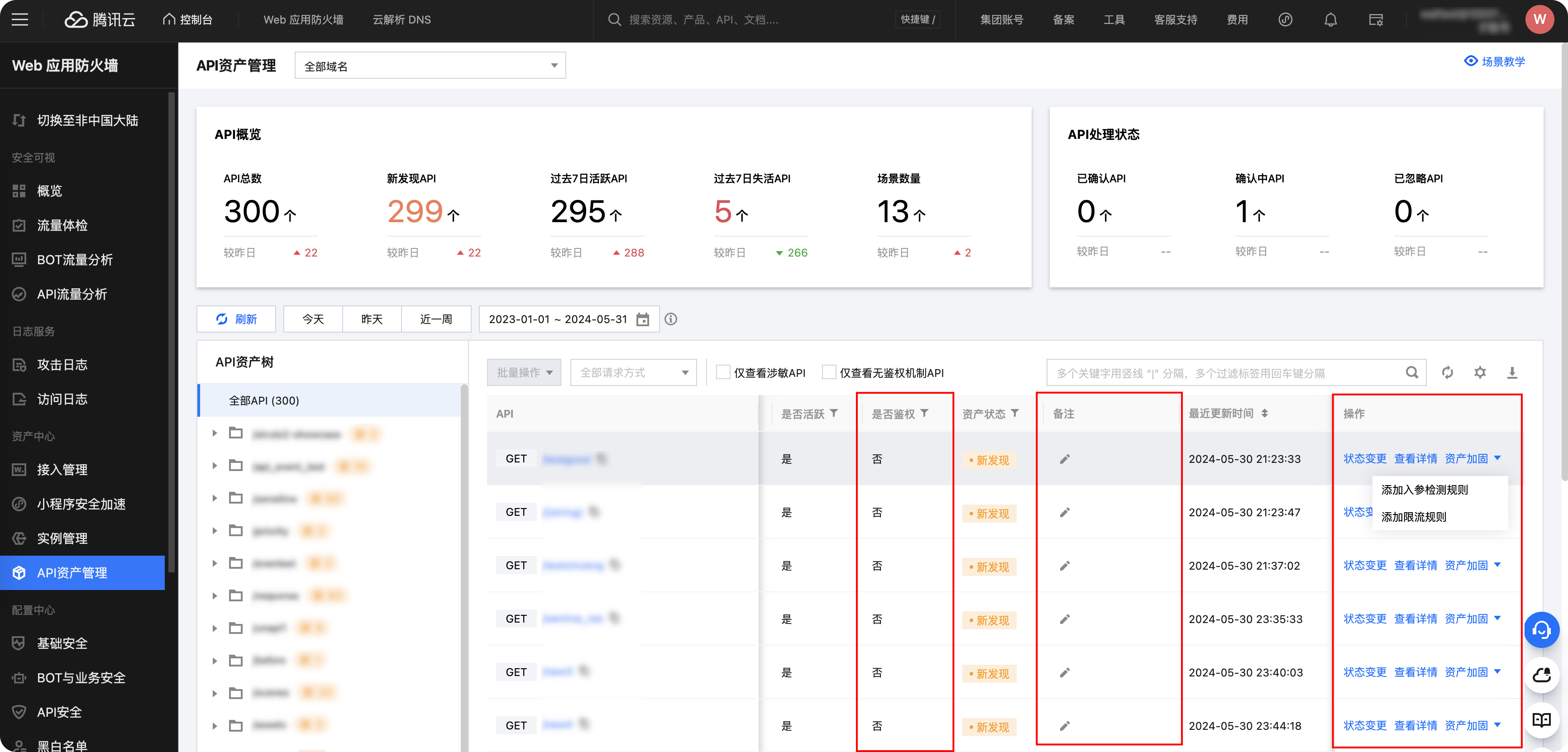 1、【新增】API资产列表新增API是否鉴权检测及展示、API备注能力,同时新增资产加固操作,支持一键对当前API添加入参检测规则、限流规则。