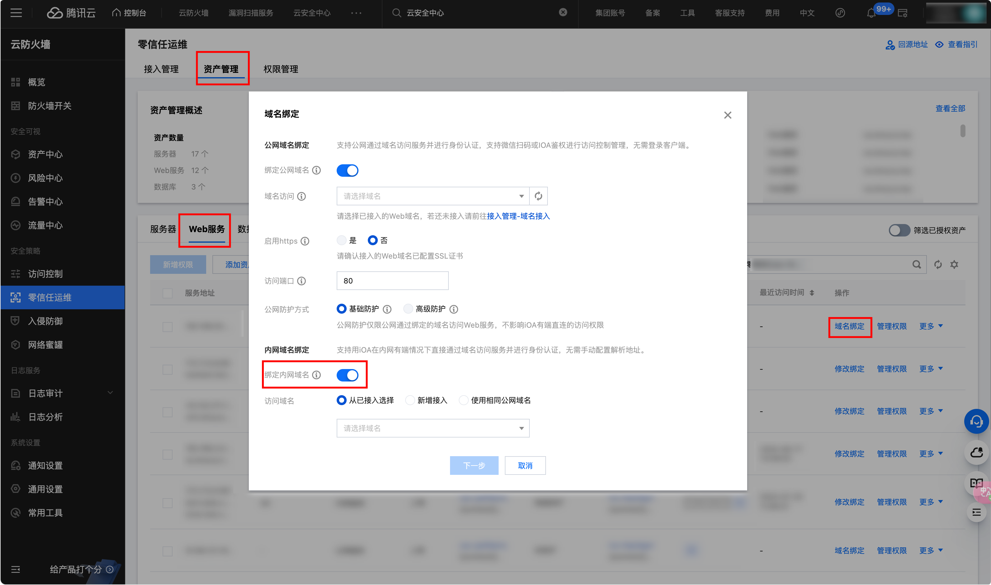 2. 进入零信任运维-资产管理-Web服务,选择需要绑定内网域名访问的Web服务,点击域名绑定,启用绑定内网域名选项开关,按照指引配置内网域名即可。