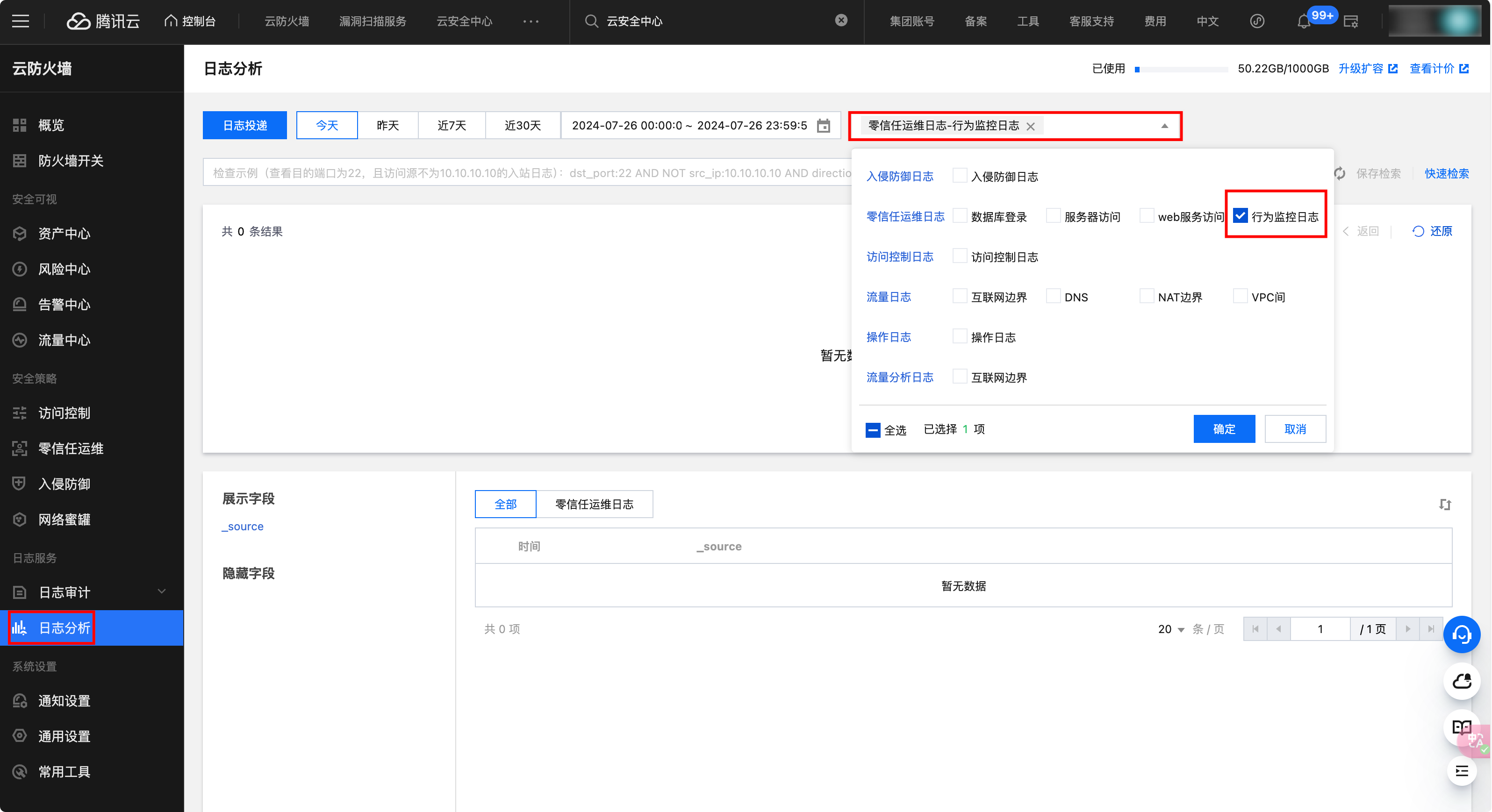 进入日志分析,选择「行为监控日志」,可以查看所有记录的审计命令日志信息。