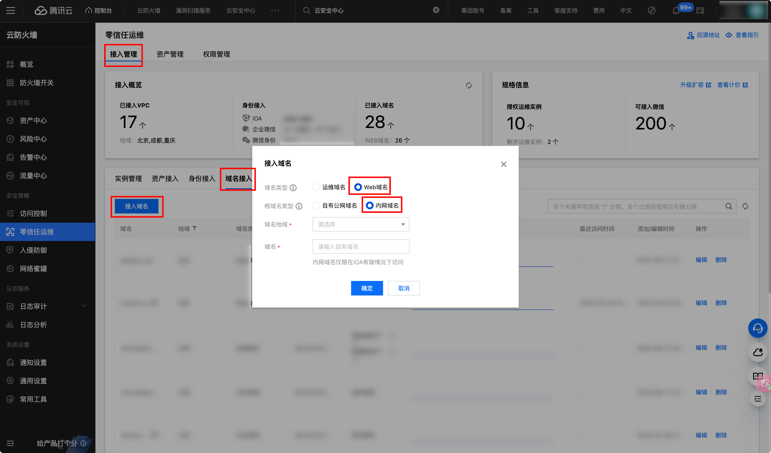 1. 进入零信任运维-接入管理-域名接入,点击接入域名,选择Web域名和内网域名。