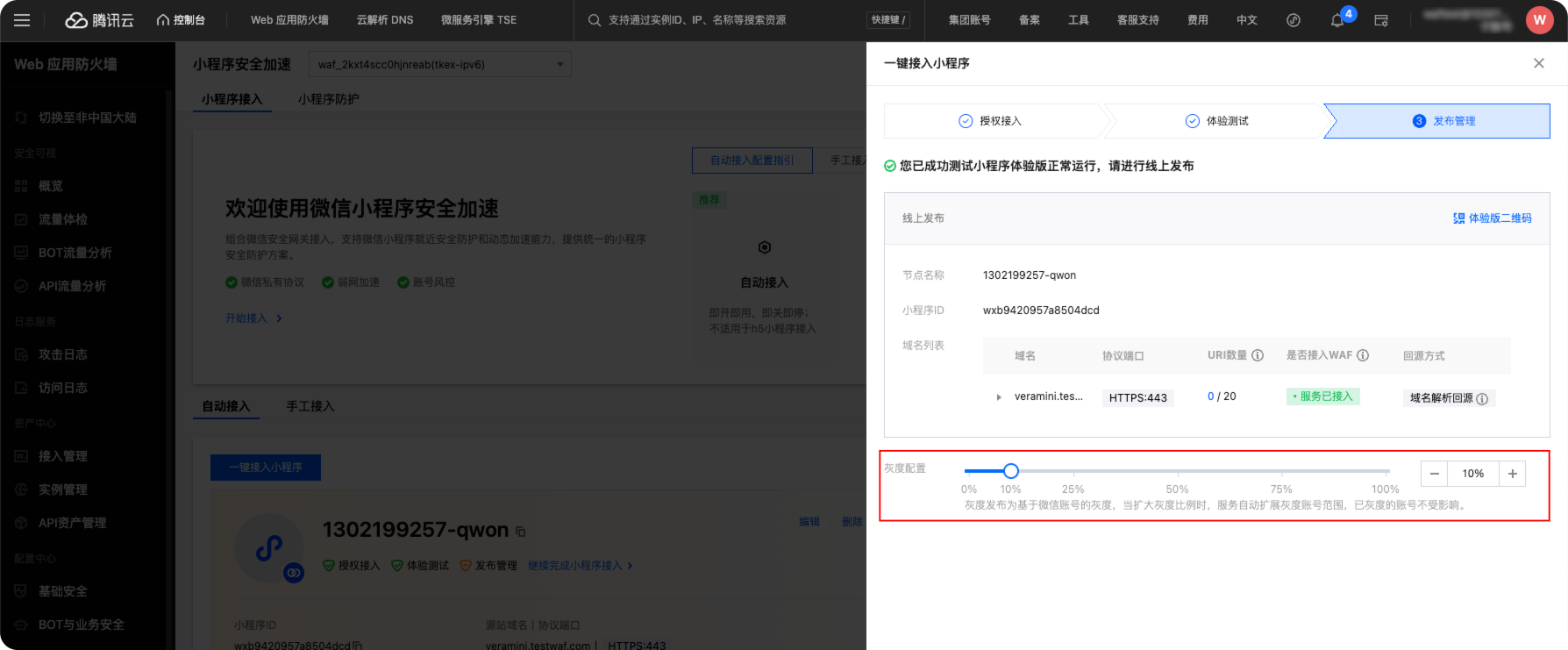 c.【新增】小程序安全加速自动接入支持自定义配置全版本发布的灰度比例,提升接入稳定性和体验。